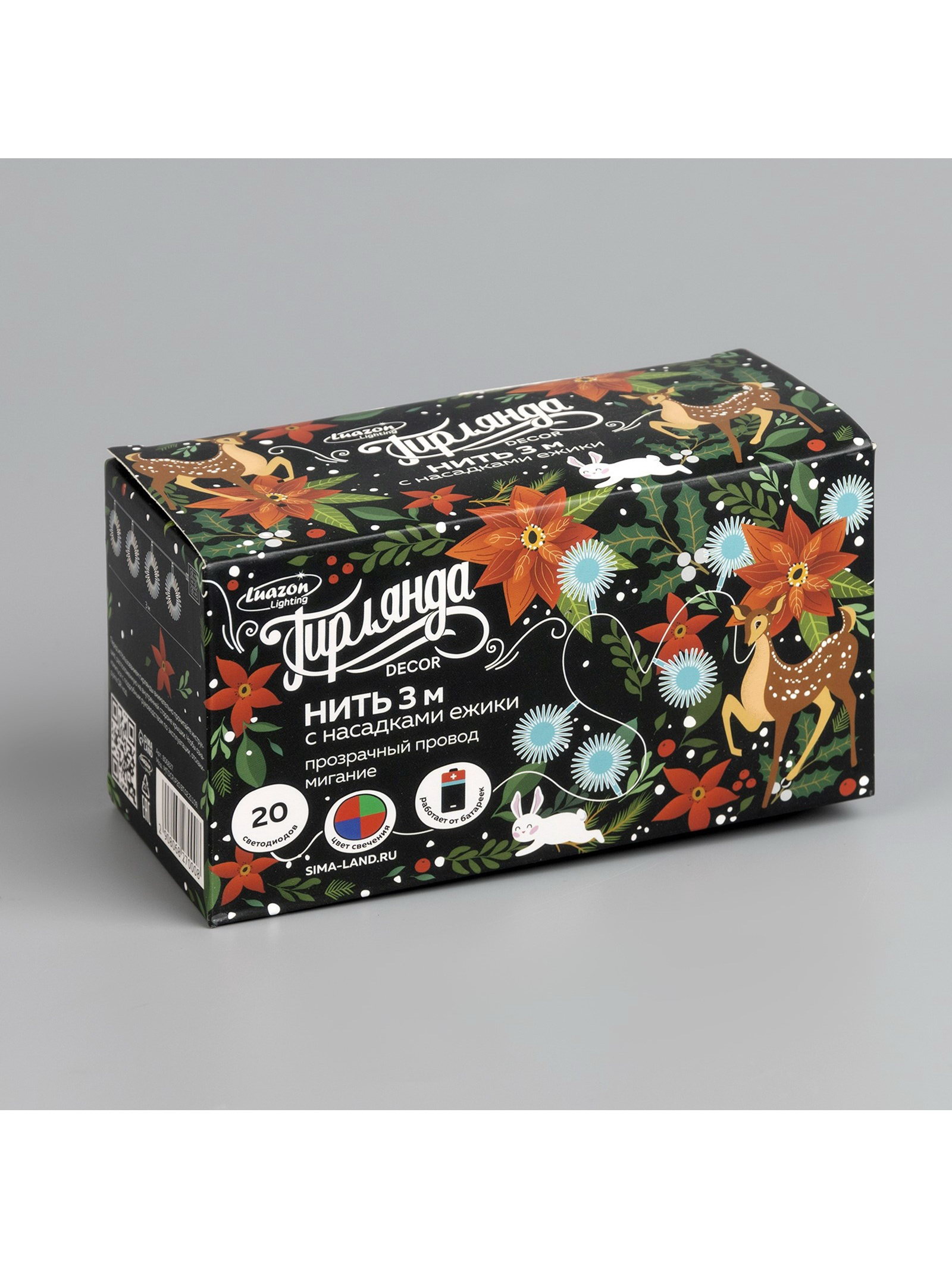 Размер упаковки: 6.5 x 7 x 13 см. Длина, м: 3 Применение: Внутреннее Вид лампы: Светодиодная Насадки: Да Цвет нити гирлянды: Прозрачный Вид гирлянды: Гирлянда-нить Количество режимов: 1 Режим работы: Мигание Тип подключения: Шнур питания Наличие блока питания: Нет Материал насадок: Пластик Гарантийный срок, мес.: 12 tnved: 9405310000 Количество ламп: 20 Материал нити: ПВХ Необходимая комплектация: Не нужна Диаметр насадки, мм: 30 Типоразмер батареек: AA (LR6) Количество батареек: 3 Вид насадки: Ёжики Цвет свечения: RG/RB Степень защиты: IP20 Тематика праздника: Новый год Температурный режим: От 0 до +35 ℃ Тип питания: От батареек