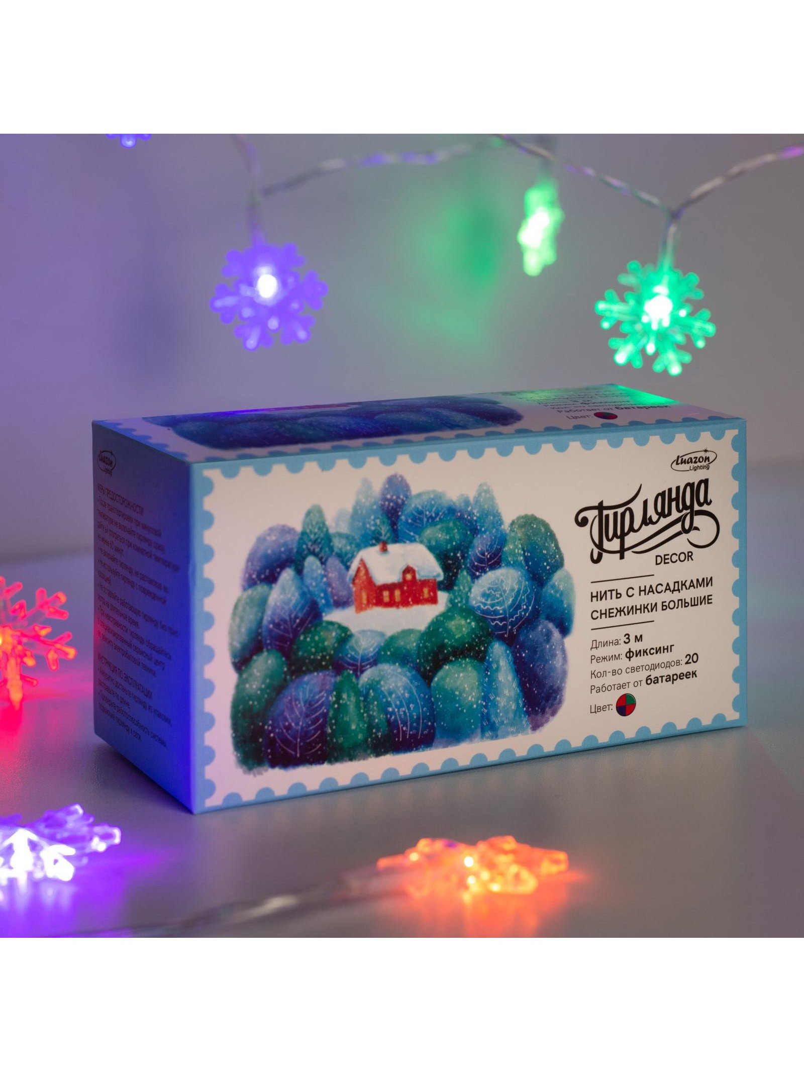 Гирлянда "Нить" 3 м с насадками "Снежинки большие", IP20, прозрачная нить, 20 LED, от батареек ААx3, свечение мульти, 7x13x6 см., Luazon Lighting, Китай