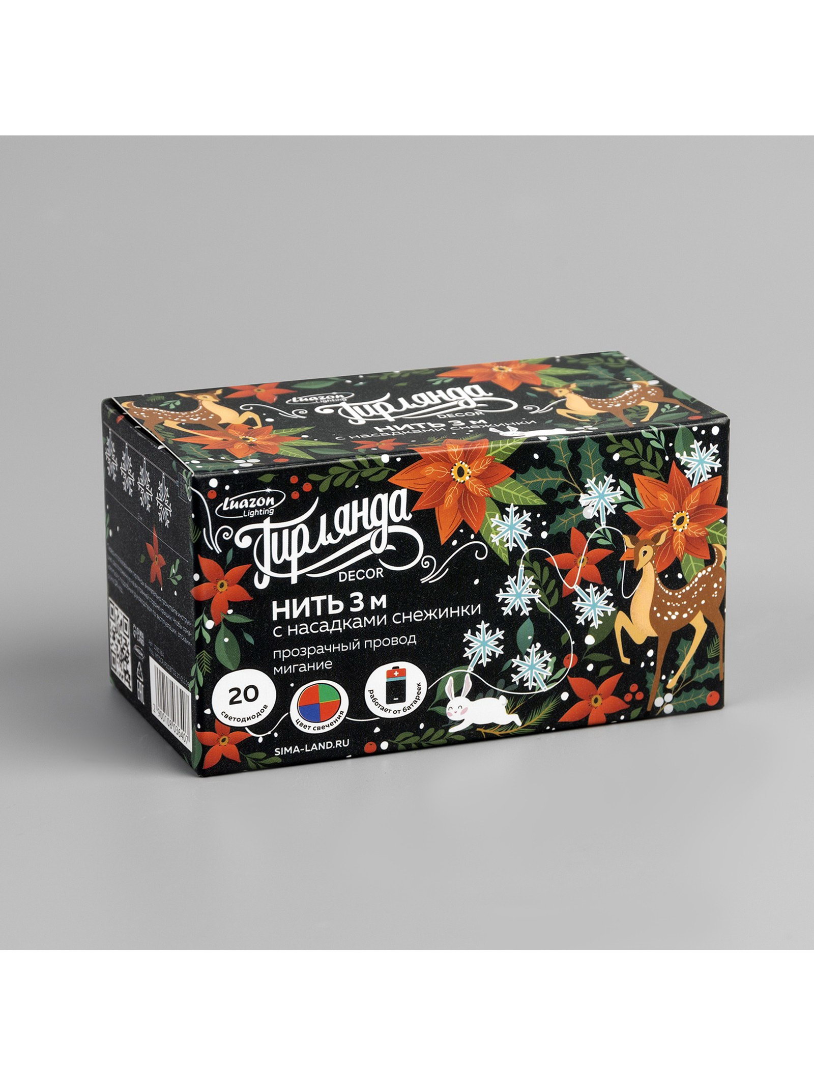 Размер упаковки: 6 x 6 x 11 см. Цвет нити гирлянды: Прозрачный Длина, м: 3 Вид лампы: Светодиодная Применение: Внутреннее Насадки: Да Вид гирлянды: Гирлянда-нить Количество режимов: 1 Режим работы: Мигание Тип подключения: Шнур питания Наличие блока питания: Нет Материал насадок: Пластик tnved: 9405310000 Гарантийный срок, мес.: 12 Количество ламп: 20 Материал нити: ПВХ Необходимая комплектация: Не нужна Количество батареек: 3 Типоразмер батареек: AA (LR6) Вид насадки: Снежинки Цвет свечения: RG/RB Степень защиты: IP20 Тематика праздника: Новый год Температурный режим: От 0 до +35 ℃ Тип питания: От батареек