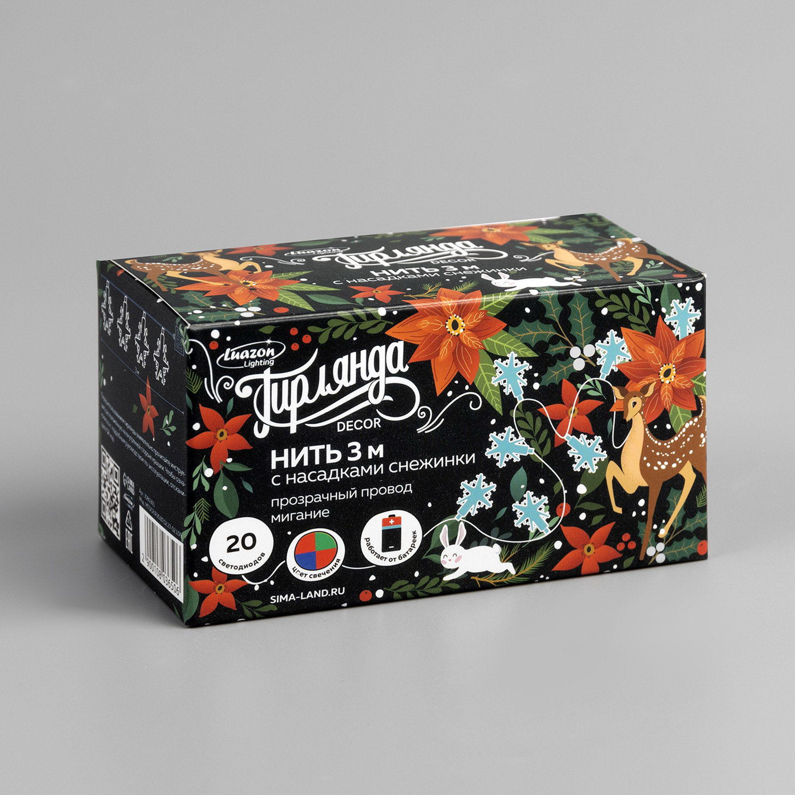 Размер упаковки: 6 x 6 x 11 см. Цвет нити гирлянды: Прозрачный Длина, м: 3 Применение: Внутреннее Вид лампы: Светодиодная Насадки: Да Вид гирлянды: Гирлянда-нить Количество режимов: 1 Режим работы: Мигание Тип подключения: Шнур питания Наличие блока питания: Нет Материал насадок: Пластик Материал насадок: Пластик tnved: 9405310000 Гарантийный срок, мес.: 12 Количество ламп: 20 Материал нити: ПВХ Необходимая комплектация: Не нужна Количество батареек: 3 Типоразмер батареек: AA (LR6) Вид насадки: Снежинки Цвет свечения: RG/RB Степень защиты: IP20 Тематика праздника: Новый год Температурный режим: От 0 до +35 ℃ Тип питания: От батареек