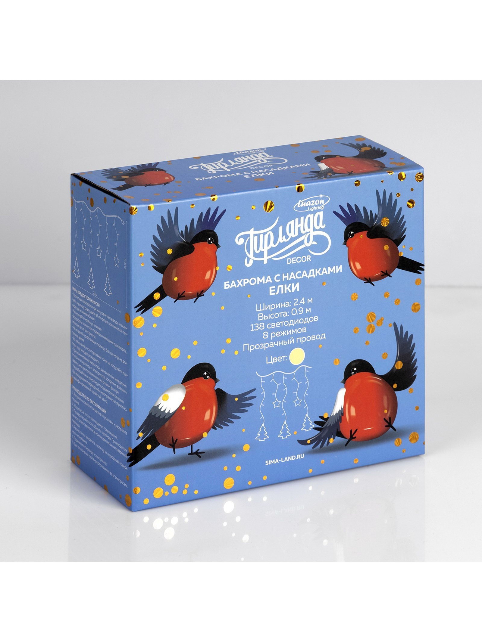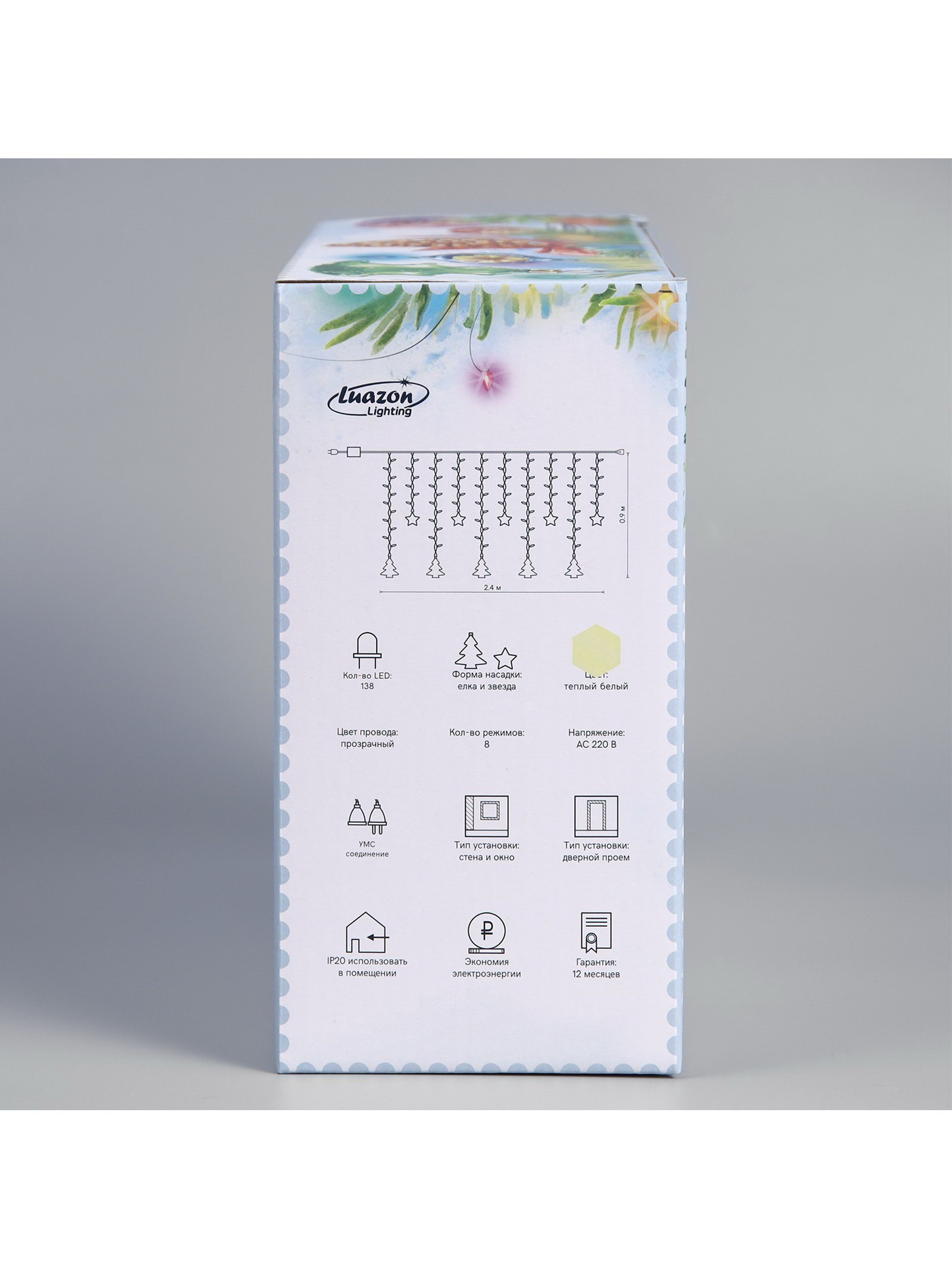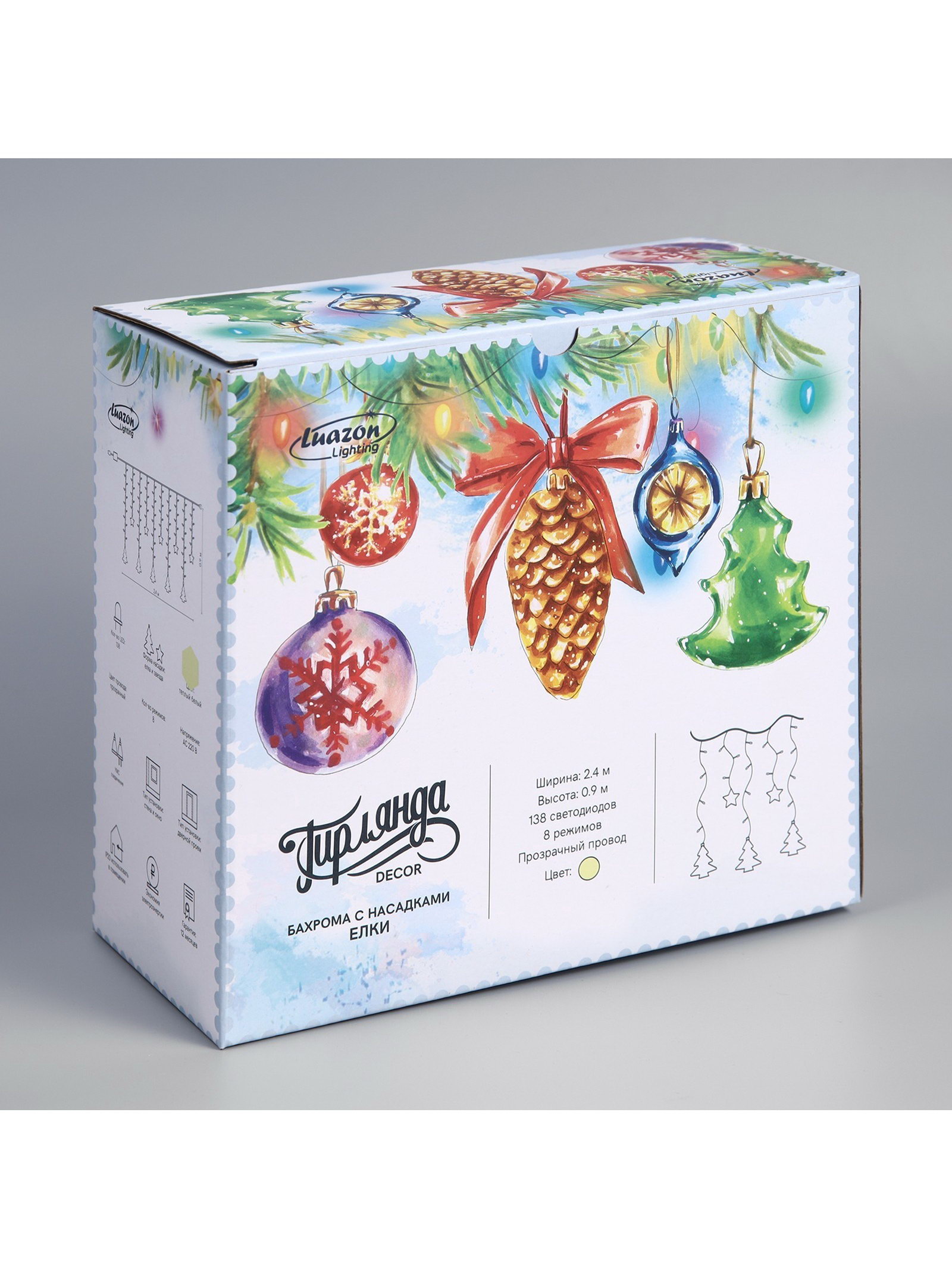 Гирлянда "Бахрома" 2.4 x 0.9 м с насадками "Ёлки", IP20, прозрачная нить, 138 LED, свечение тёплое белое, 8 режимов, 220 В, 10x20x20 см., Luazon Lighting, Китай