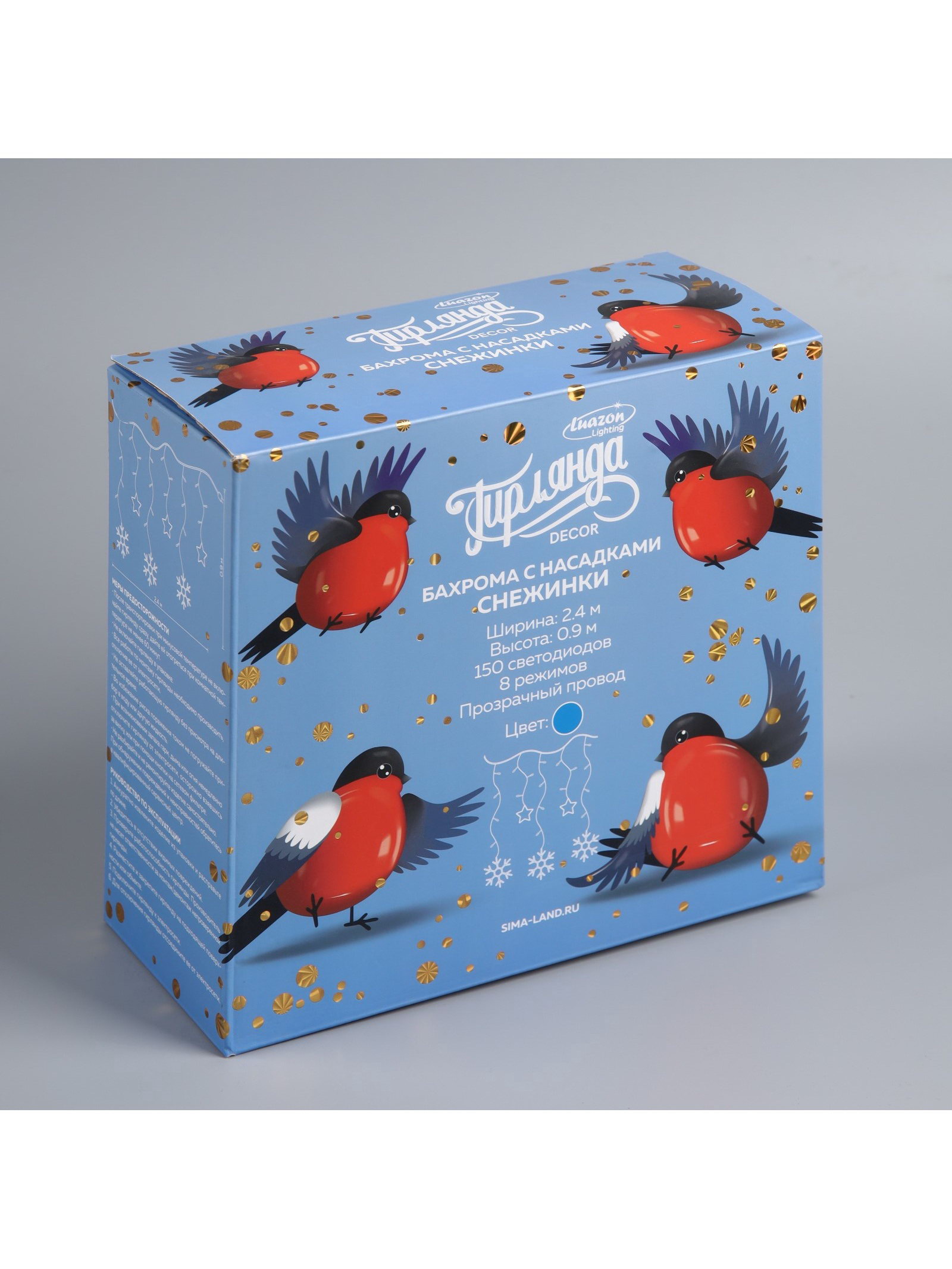 Гирлянда "Бахрома" 2.4x0.9 м с насадками "Снежинки", IP20, прозрачная нить, 150 LED, свечение синее, 8 режимов, 220 В, 10x20x20 см., Luazon Lighting, Китай
