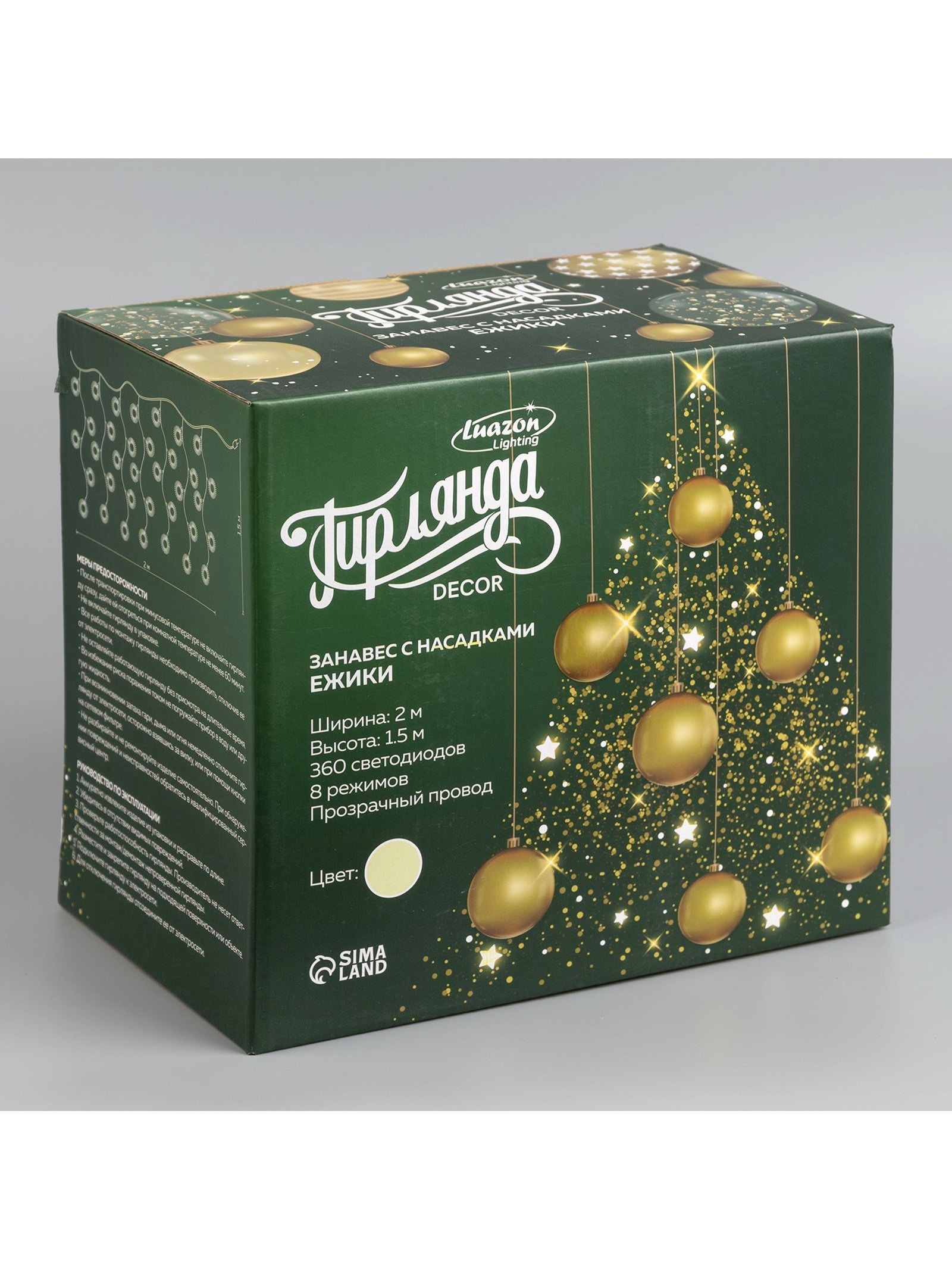 Гирлянда "Занавес" 2x1.5 м с насадками "Ёжики", IP20, прозрачная нить, 360 LED, свечение тёплое белое, 8 режимов, 220 В, Luazon Lighting, Китай