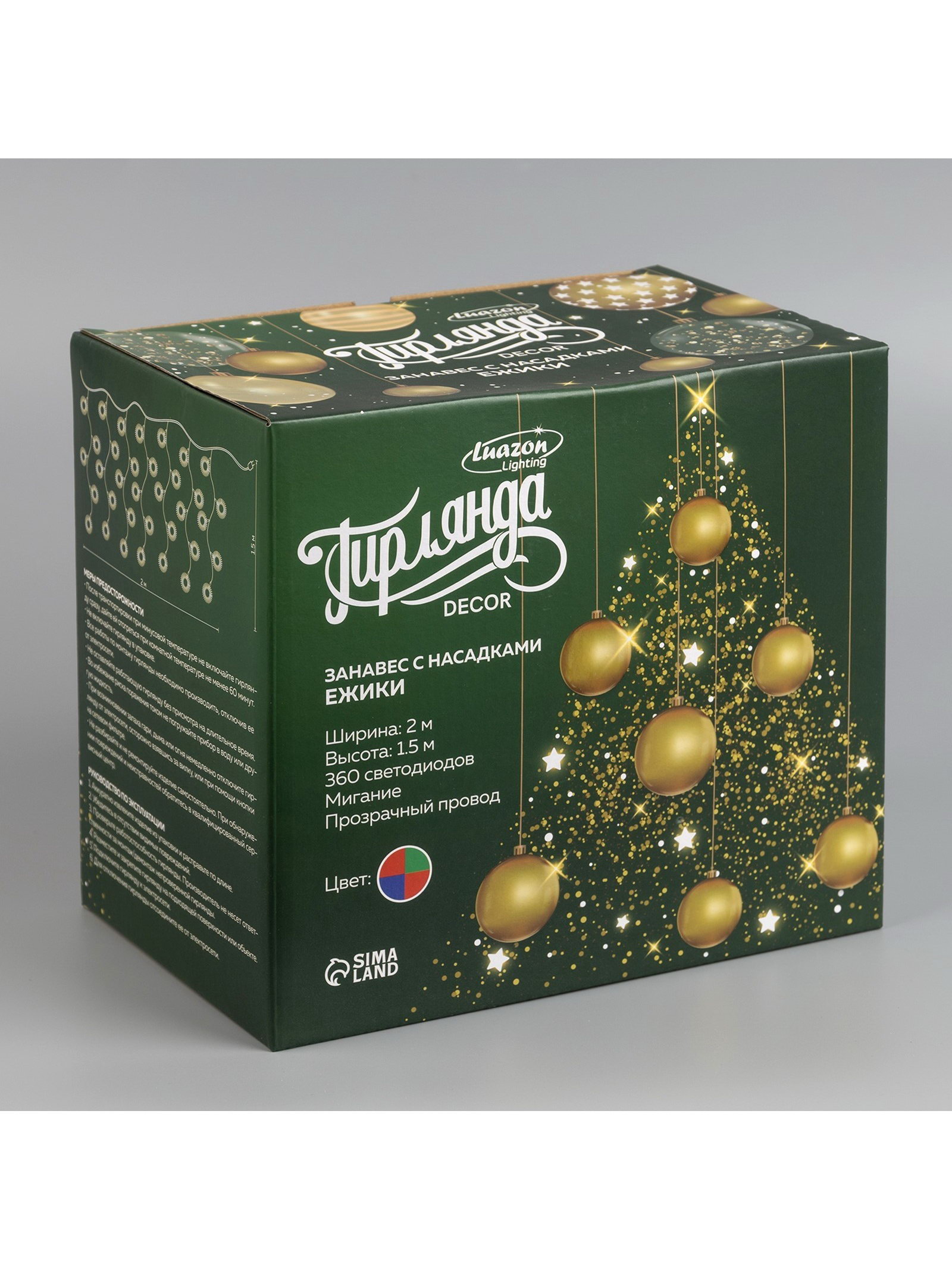 Гирлянда "Занавес" 2x1.5 м с насадками "Ёжики", IP20, прозрачная нить, 360 LED, свечение мульти, Luazon Lighting, Китай
