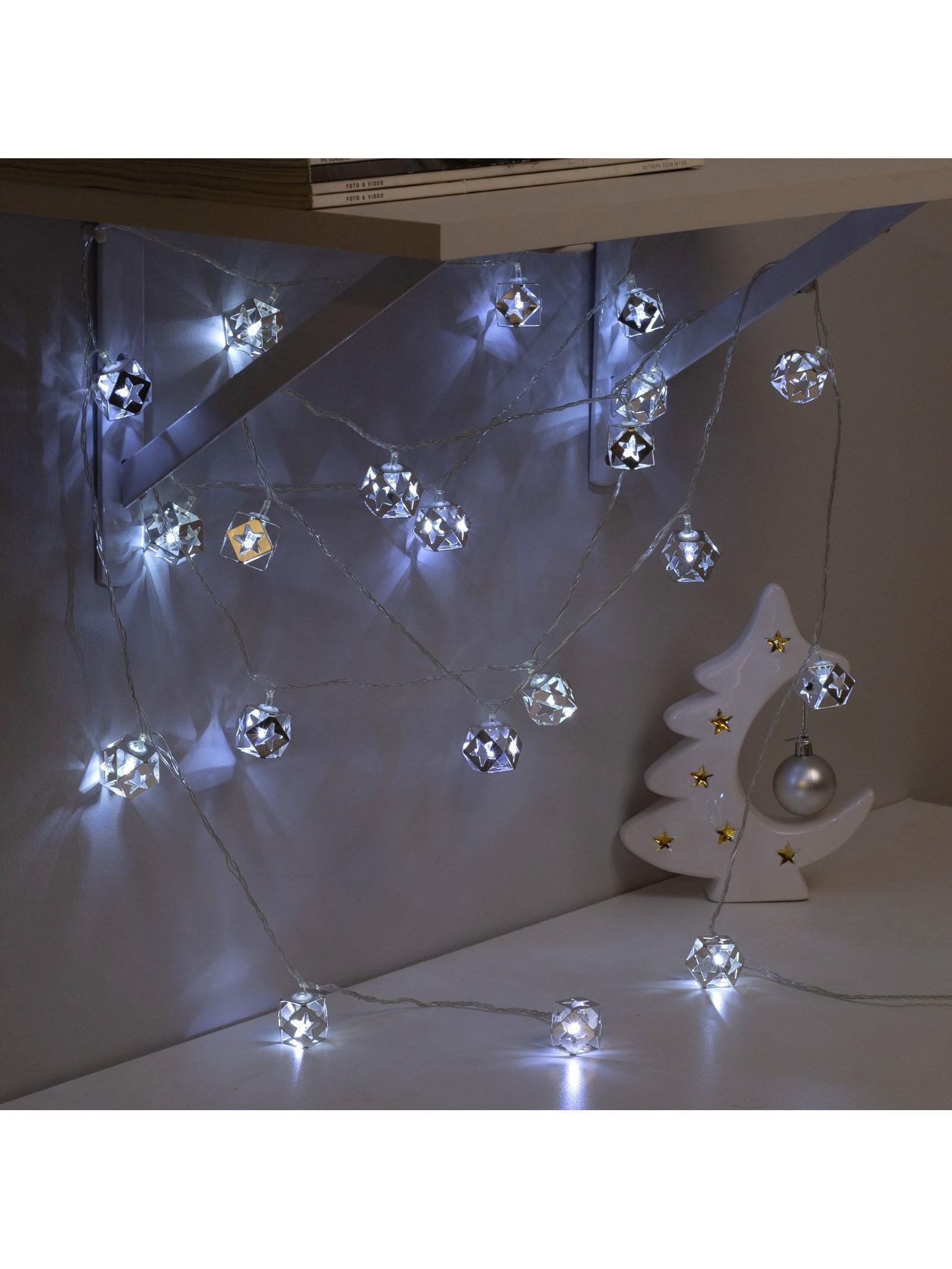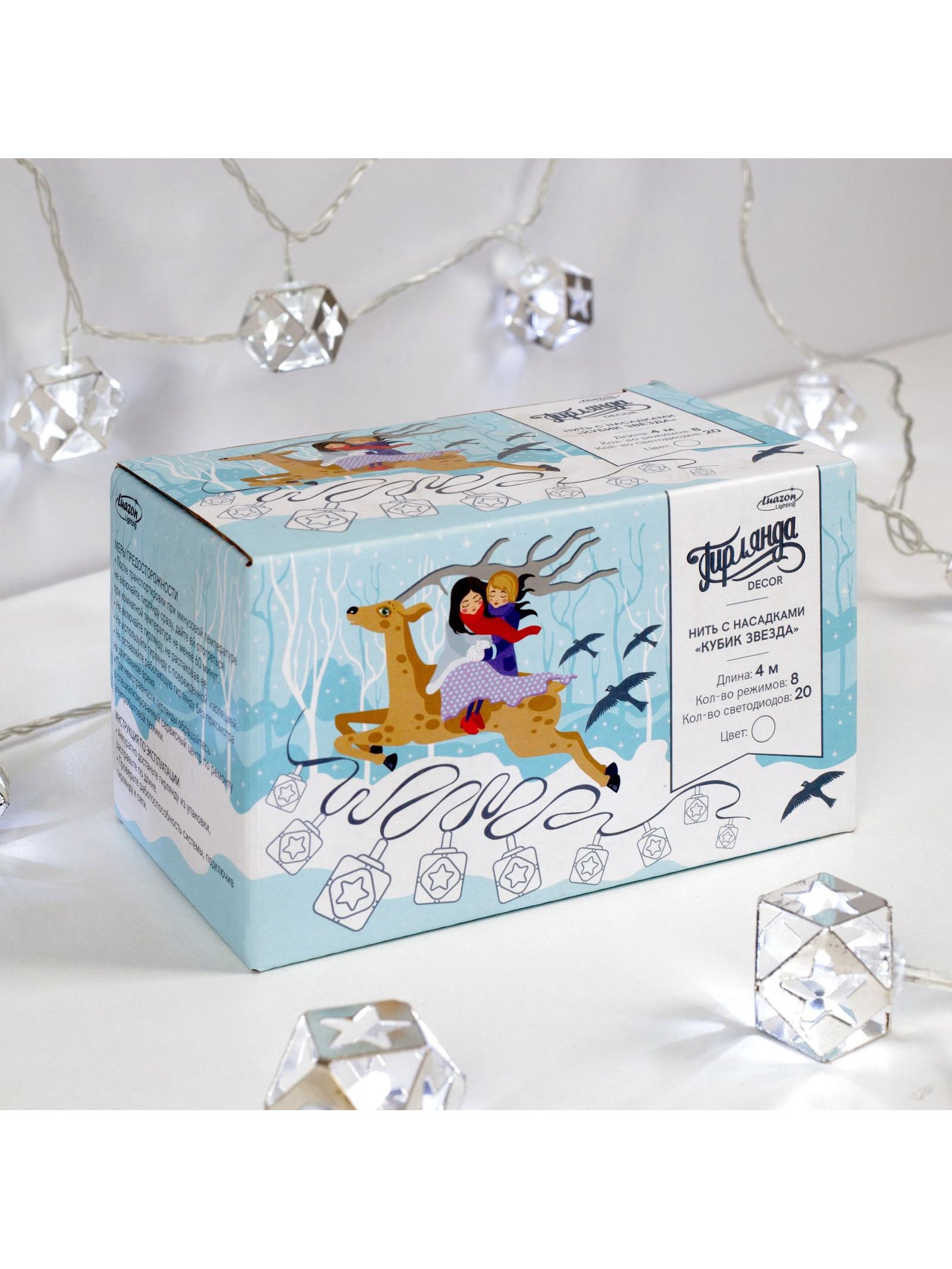 Гирлянда "Нить" 4 м с насадками "Кубик звезда", IP20, прозрачная нить, 20 LED, свечение белое, 8 режимов, 220 В, Luazon Lighting, Китай