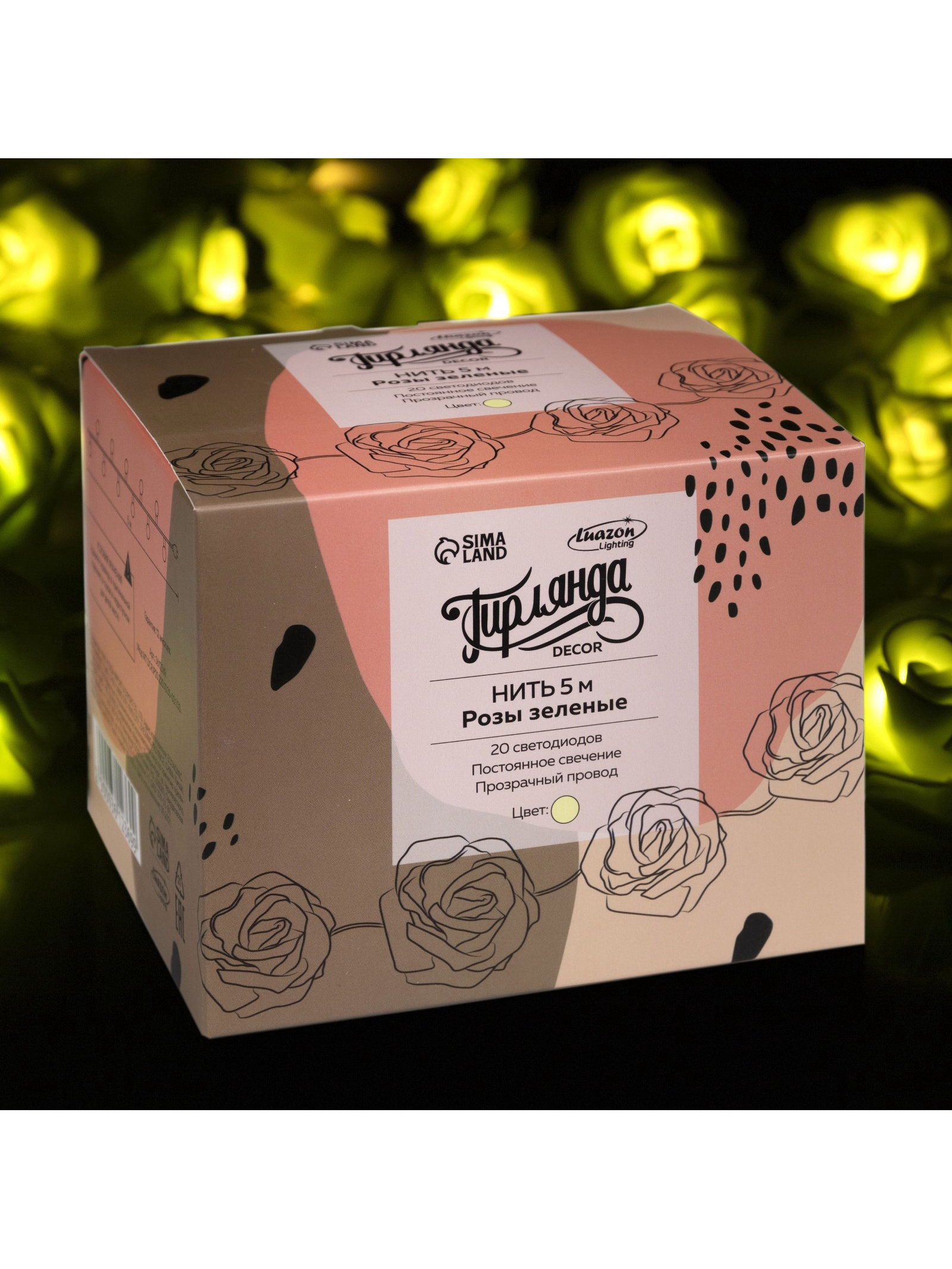 Гирлянда "Нить" 5 м с насадками "Розы зелёные", IP20, прозрачная нить, 20 LED, свечение тёплое белое, 220 В, 12x14x11 см., Luazon Lighting, Китай
