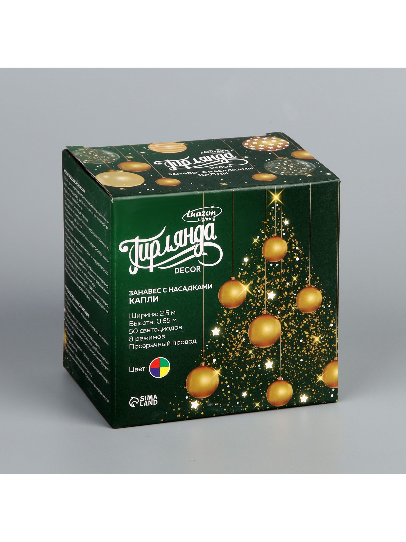 Гирлянда "Занавес" 2.5x0.65 м с насадками "Капли", IP20, прозрачная нить, 50 LED, свечение мульти, 8 режимов, 220 В, Luazon Lighting, Китай
