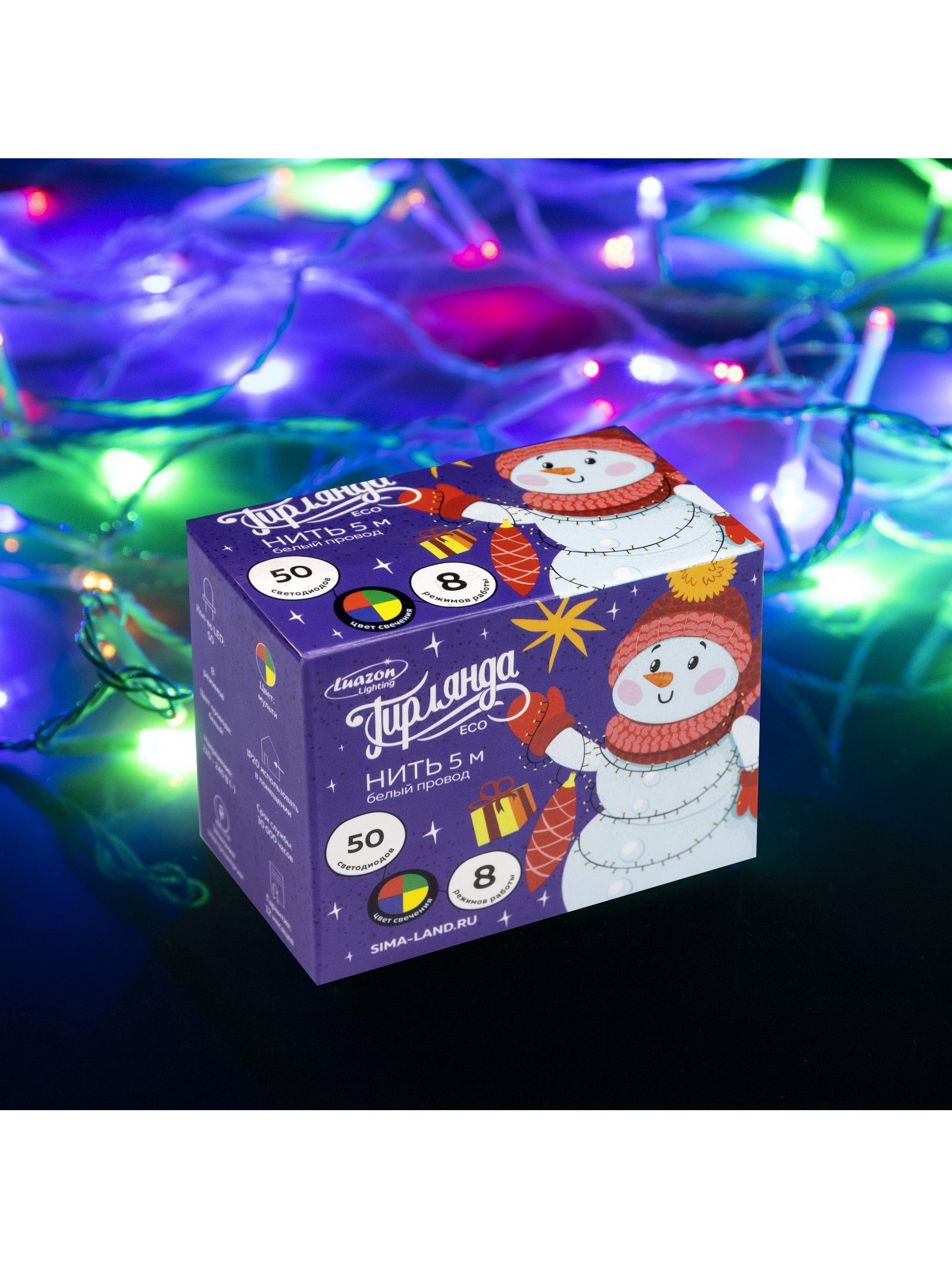 Гирлянда "Нить" 5 м, IP20, белая нить, 50 LED, 8 режимов, 220 В, свечение мульти, 5x8x6.5 см., Luazon Lighting, Китай