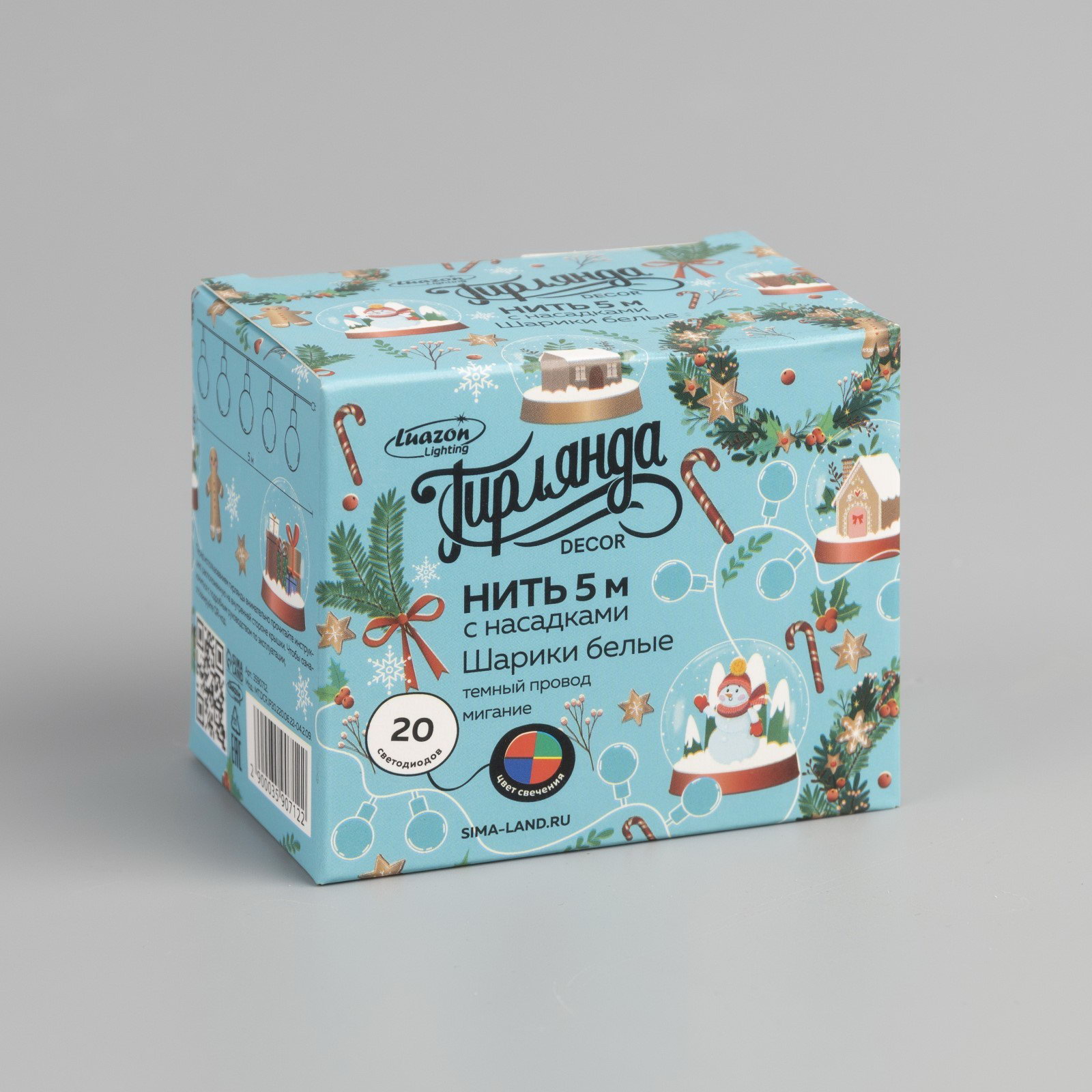 Гирлянда "Нить" 5 м с насадками "Шарики белые", IP20, тёмная нить, 20 LED, свечение мульти, Luazon Lighting, Китай