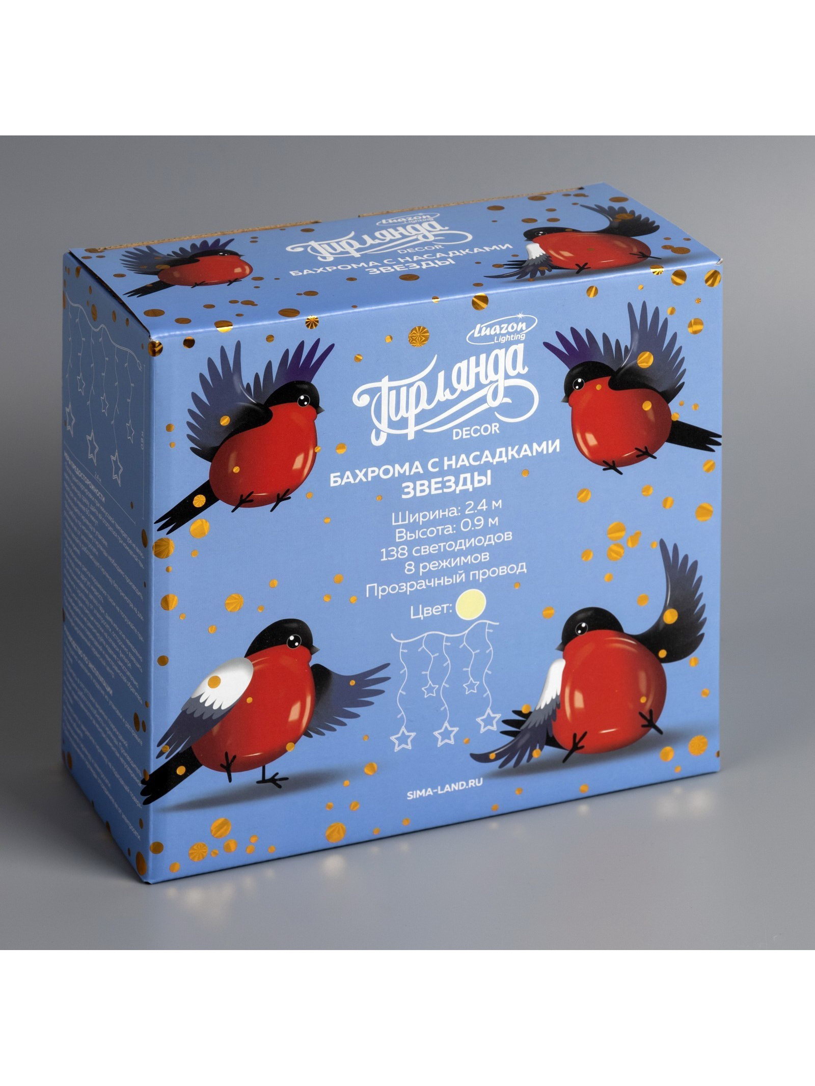 Размер упаковки: 10 x 20 x 21.5 см. Применение: Внутреннее Вид гирлянды: Бахрома Размер, м: 2.4 x 0.9 Количество режимов: 8 Вид лампы: Светодиодная Цвет свечения: Тёплый белый Режим работы: Задаётся контроллером Цвет нити гирлянды: Прозрачный Наличие блока питания: Нет Насадки: Да Тип подключения: С контроллером Материал насадок: Пластик tnved: 9405310000 Гарантийный срок, мес.: 12 Количество ламп: 138 Материал нити: ПВХ Необходимая комплектация: Не нужна Вид насадки: Звёзды Ширина, м: 2.4 Высота, м: 0.9 Степень защиты: IP20 Тематика праздника: Новый год Температурный режим: От -10 до +35 ℃ Тип питания: От сети 220 В