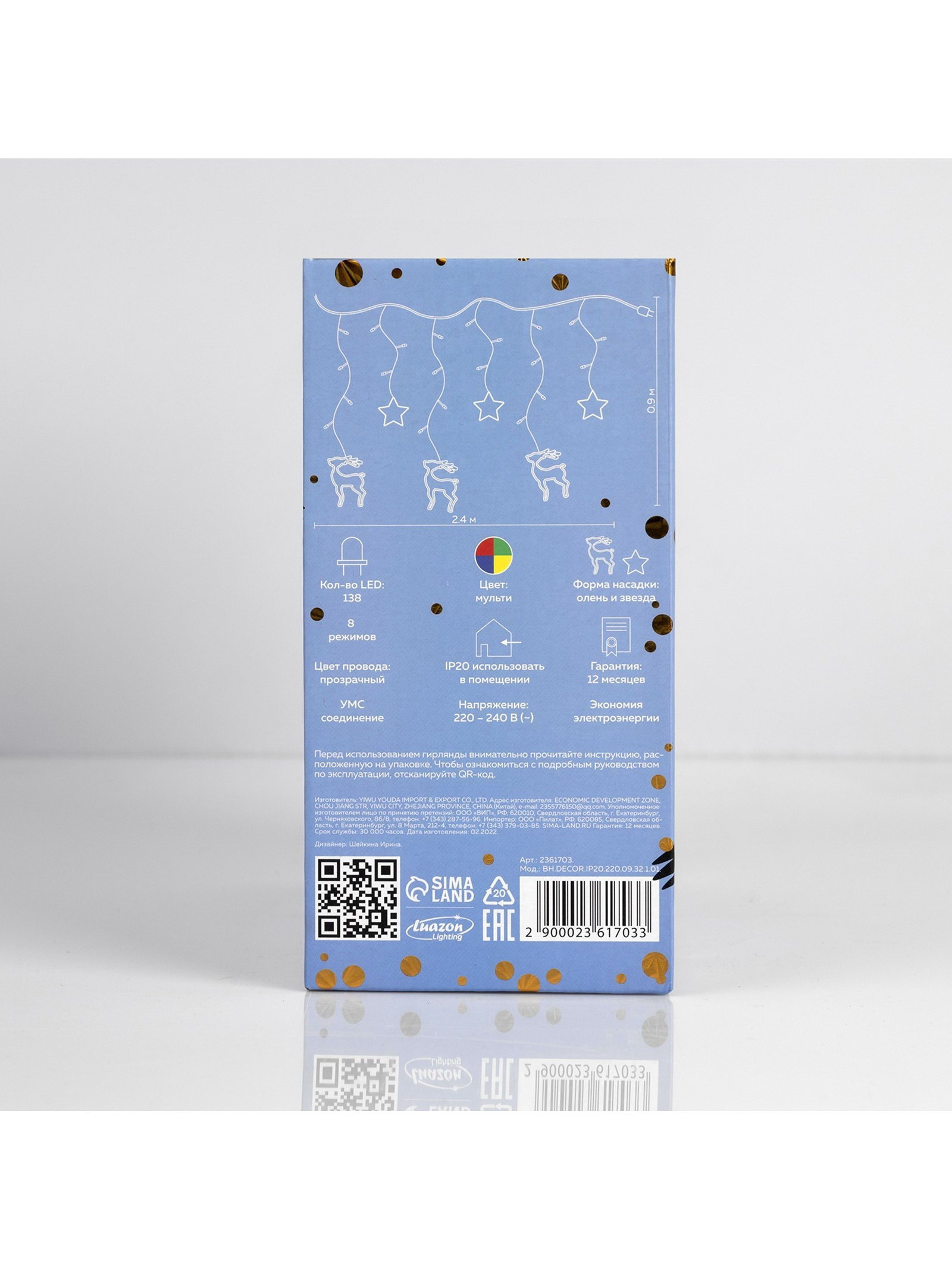 Размер упаковки: 10 x 20 x 21.5 см. Применение: Внутреннее Вид гирлянды: Бахрома Размер, м: 2.4 x 0.9 Вид лампы: Светодиодная Цвет свечения: Мульти Режим работы: Задаётся контроллером Цвет нити гирлянды: Прозрачный Насадки: Да Наличие блока питания: Нет Тип подключения: С контроллером Количество режимов: 8 Материал насадок: Пластик tnved: 8539514000 Гарантийный срок, мес.: 12 Количество ламп: 138 Материал нити: ПВХ Необходимая комплектация: Не нужна Вид насадки: Олени Высота, м: 0.9 Ширина, м: 2.4 Степень защиты: IP20 Тематика праздника: Новый год Температурный режим: От -10 до +35 ℃ Тип питания: От сети 220 В