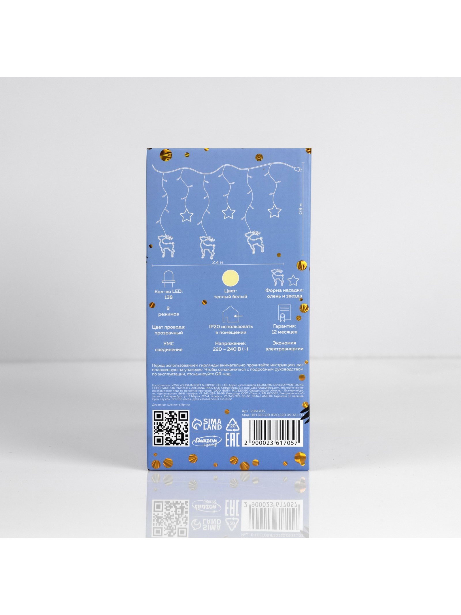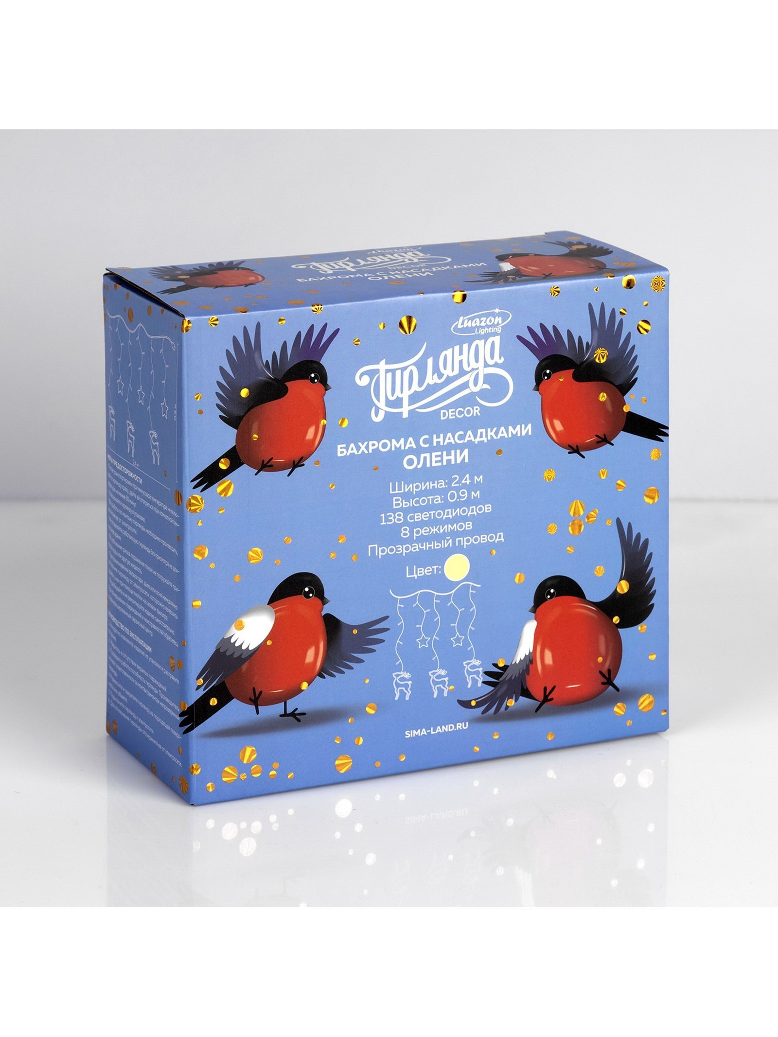 Размер упаковки: 10 x 20 x 21.5 см. Применение: Внутреннее Вид гирлянды: Бахрома Размер, м: 2.4 x 0.9 Вид лампы: Светодиодная Цвет свечения: Тёплый белый Режим работы: Задаётся контроллером Насадки: Да Наличие блока питания: Нет Количество режимов: 8 Цвет нити гирлянды: Прозрачный Тип подключения: С контроллером Материал насадок: Пластик Материал насадок: Пластик tnved: 8539514000 Гарантийный срок, мес.: 12 Количество ламп: 138 Материал нити: ПВХ Необходимая комплектация: Не нужна Вид насадки: Олени Высота, м: 0.9 Ширина, м: 2.4 Степень защиты: IP20 Тематика праздника: Новый год Температурный режим: От -10 до +35 ℃ Тип питания: От сети 220 В
