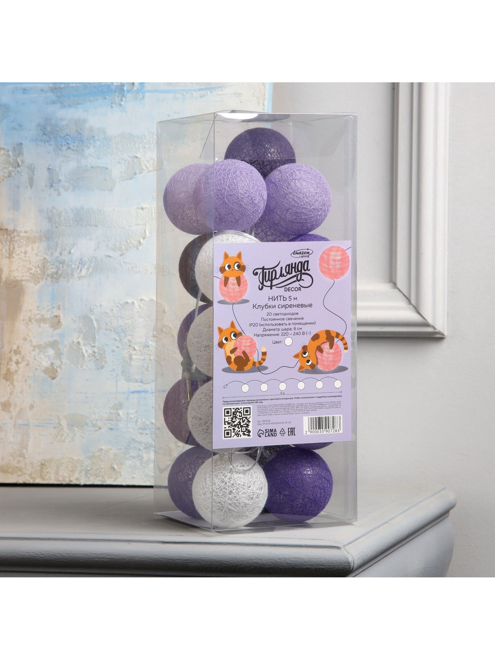 Гирлянда "Нить" 5 м с насадками "Клубки сиреневые", IP20, прозрачная нить, 20 LED, свечение белое, 220 В, 6х6х12.5 см., Luazon Lighting, Китай