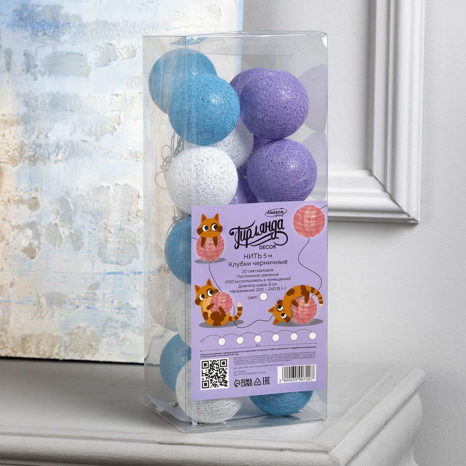 Гирлянда - нить, 5 м с насадками "Клубки черничные", IP20, прозрачная нить, 20 LED, свечение белое, 220 В, 6 см., Luazon Lighting, Китай