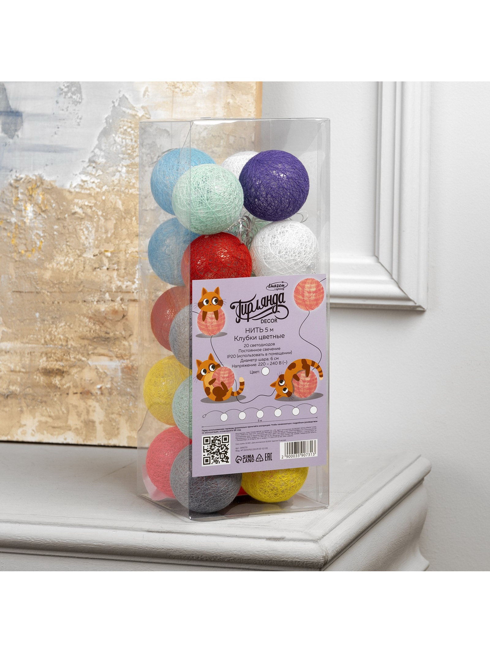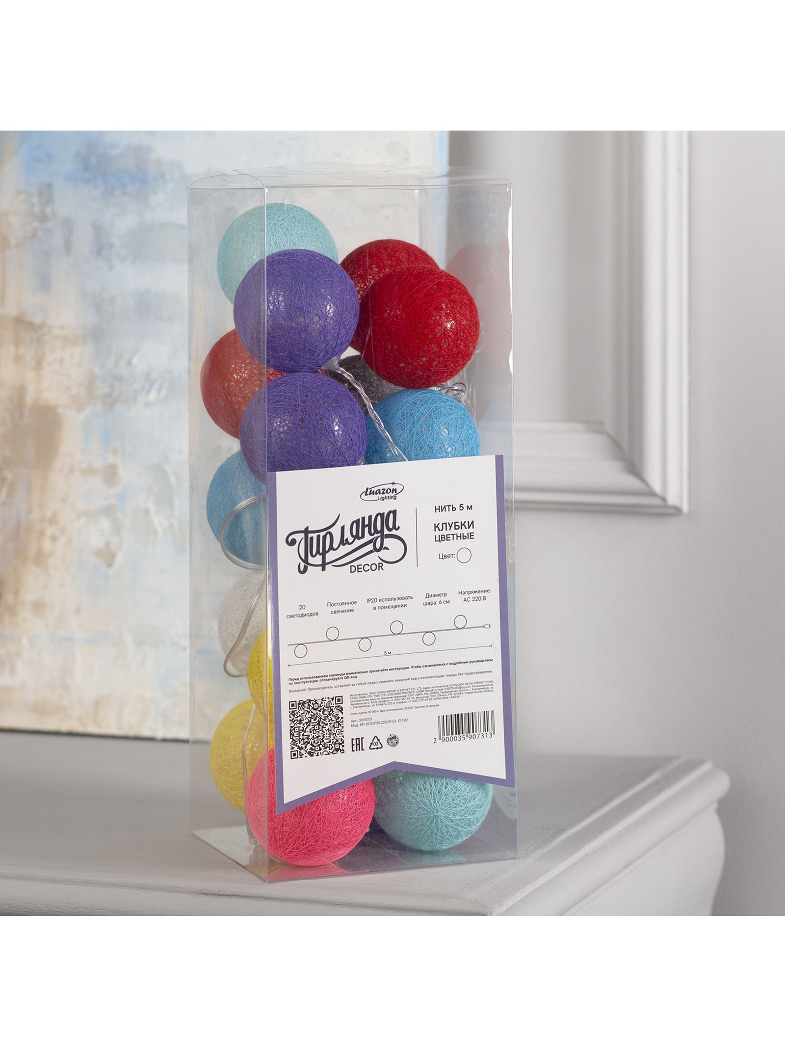 Гирлянда "Нить" 5 м с насадками "Клубки цветные", IP20, прозрачная нить, 20 LED, свечение белое, 220 В, 6 см., Luazon Lighting, Китай