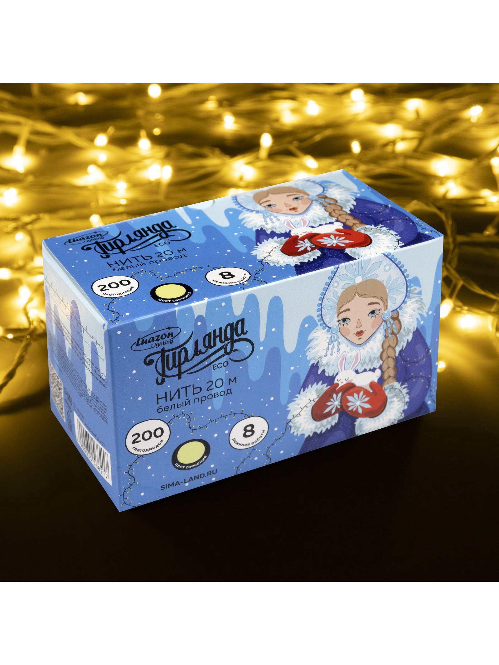Гирлянда "Нить" 20 м, IP20, белая нить, 200 LED, свечение тёплое белое, 8 режимов, 220 В, 8x15x9 см., Luazon Lighting, Китай