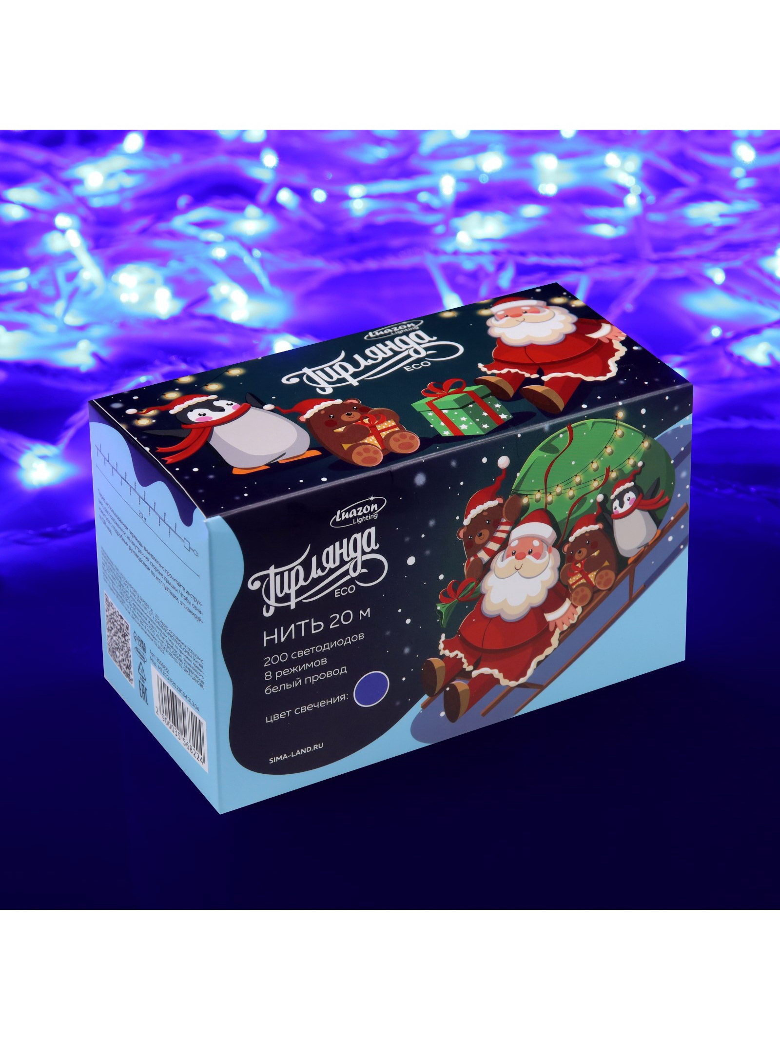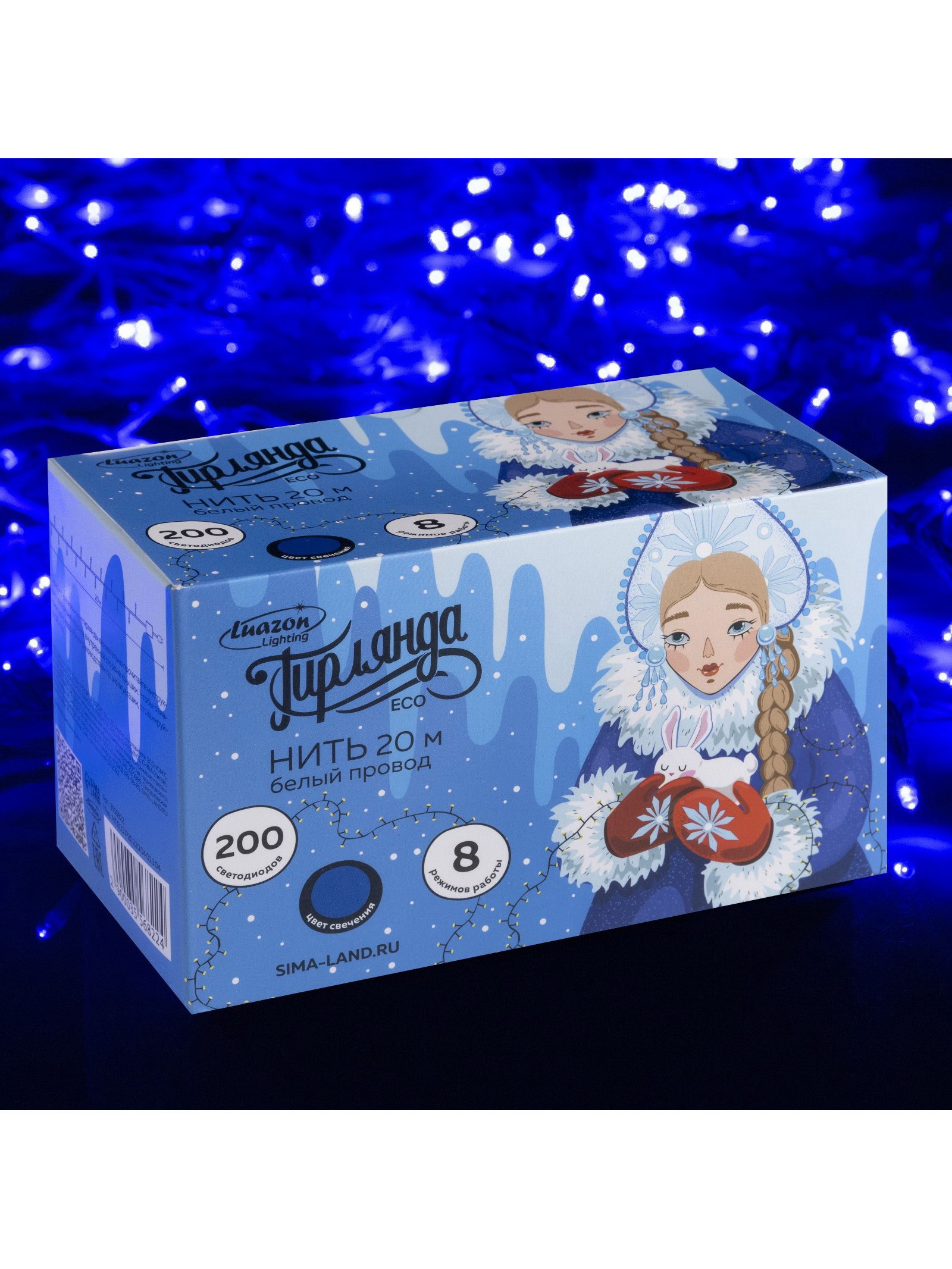 Гирлянда "Нить" 20 м, IP20, белая нить, 200 LED, свечение синее, 8 режимов, 220 В, Luazon Lighting, Китай