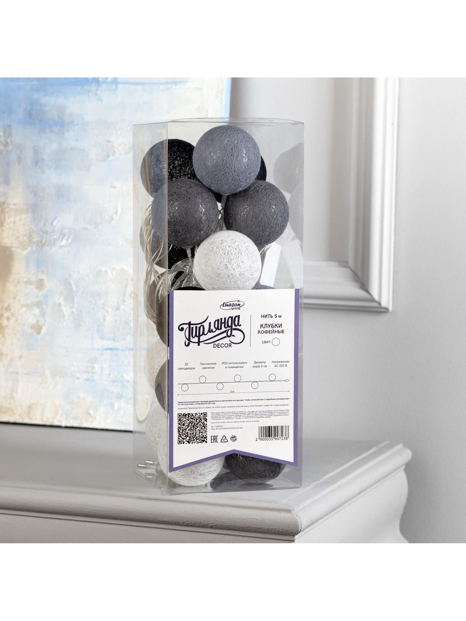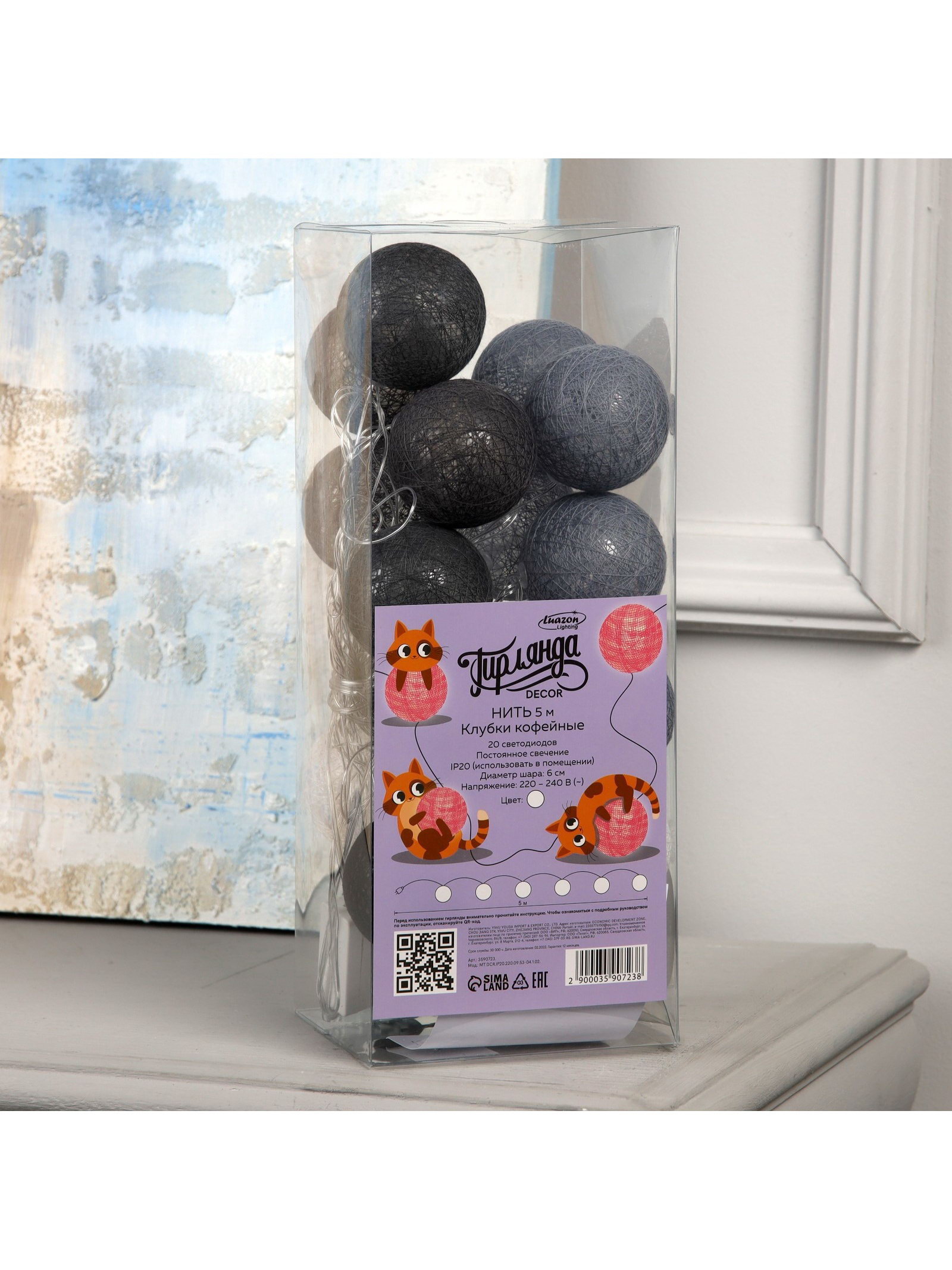 Гирлянда "Нить" 5 м с насадками "Клубки кофейные", IP20, прозрачная нить, 20 LED, свечение белое, 220 В, 6 см., Luazon Lighting, Китай