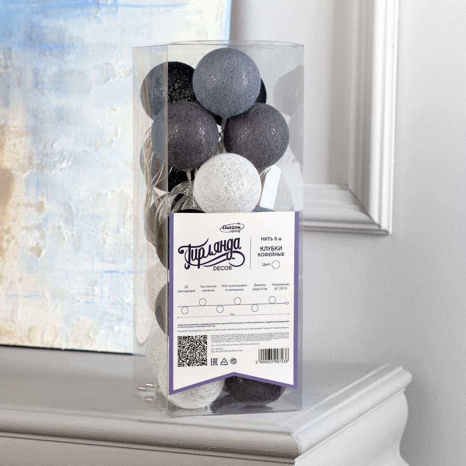 Гирлянда - нить, 5 м с насадками "Клубки кофейные", IP20, прозрачная нить, 20 LED, свечение белое, 220 В, 6 см., Luazon Lighting, Китай