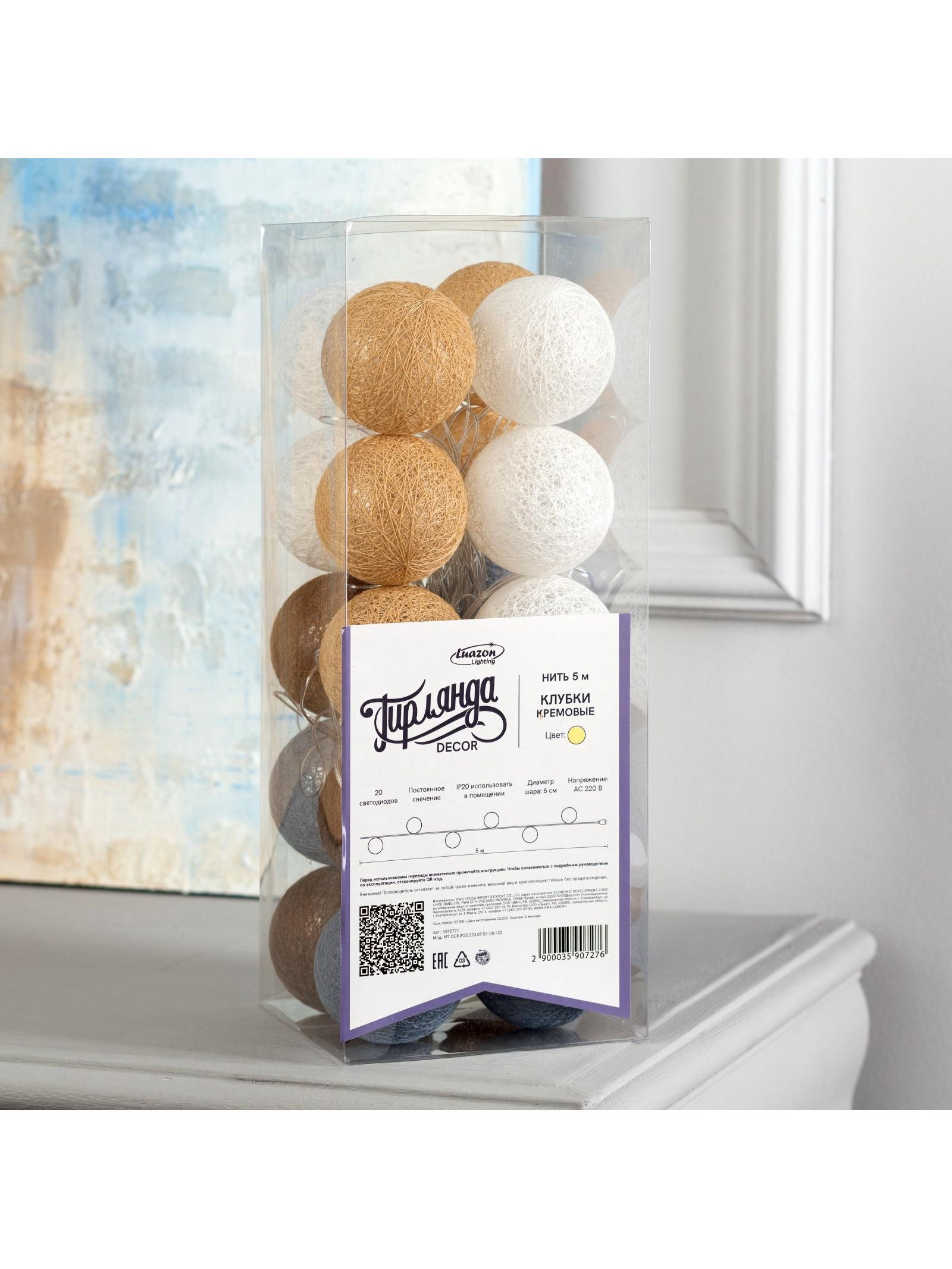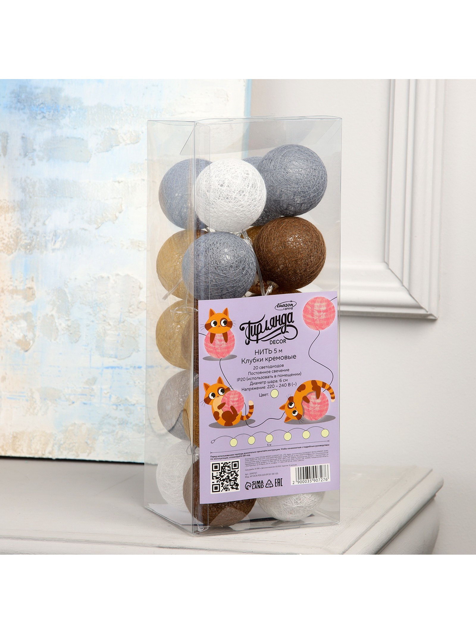 Размер упаковки: 12 x 12 x 33 см. Материал насадок: Текстиль tnved: 9405410000 Гарантийный срок, мес.: 12 Количество режимов: 1 Цвет нити гирлянды: Прозрачный Наличие блока питания: Нет Длина, м: 5 Вид гирлянды: Гирлянда-нить Тип подключения: Шнур питания Применение: Внутреннее Режим работы: Постоянное свечение Вид лампы: Светодиодная Насадки: Да Количество ламп: 20 Материал нити: ПВХ Цвет свечения: Тёплый белый Необходимая комплектация: Не нужна Вид насадки: Клубки Степень защиты: IP20 Тематика праздника: Новый год Температурный режим: От -10 до +35 ℃ Тип питания: От сети 220 В
