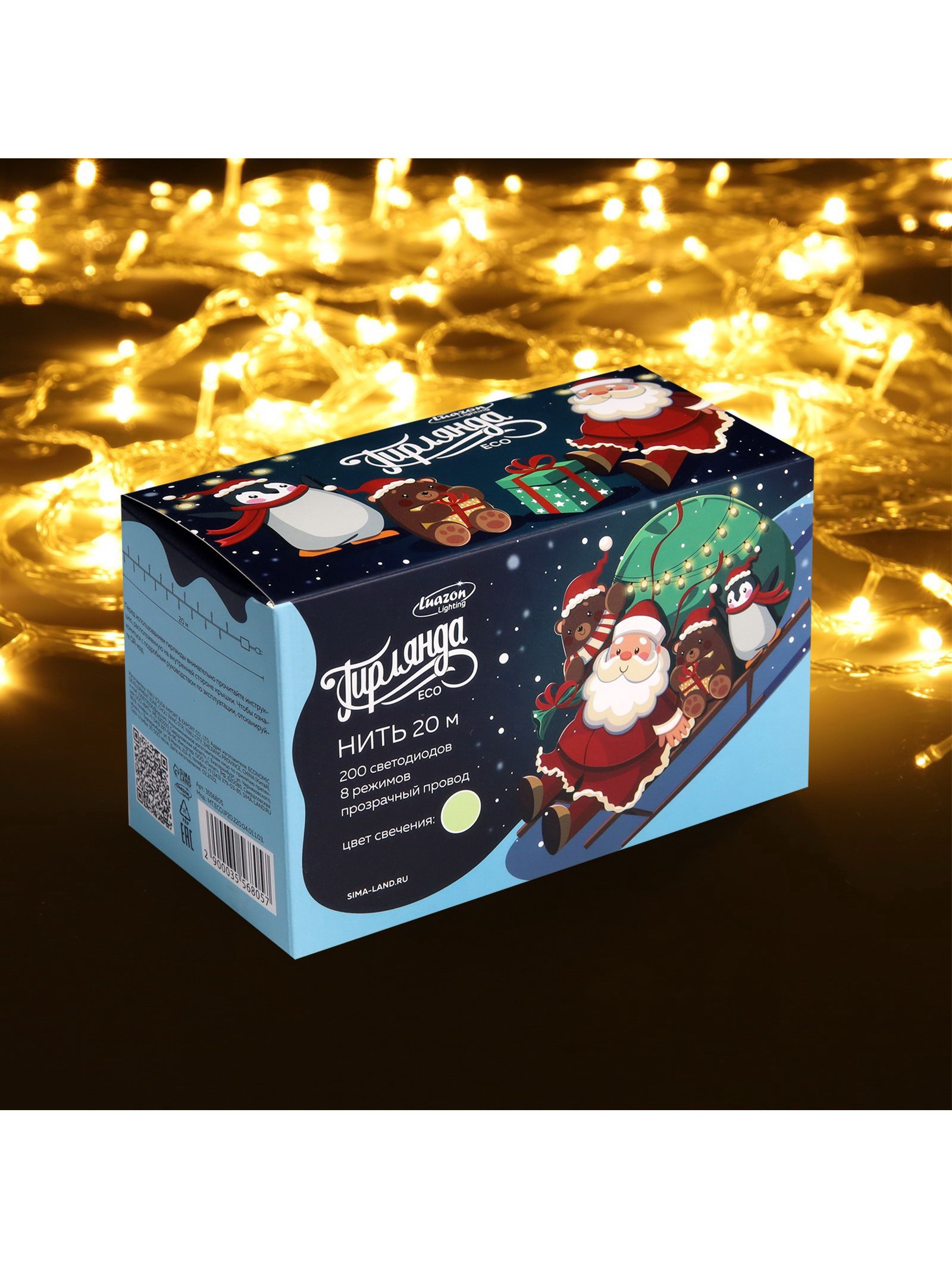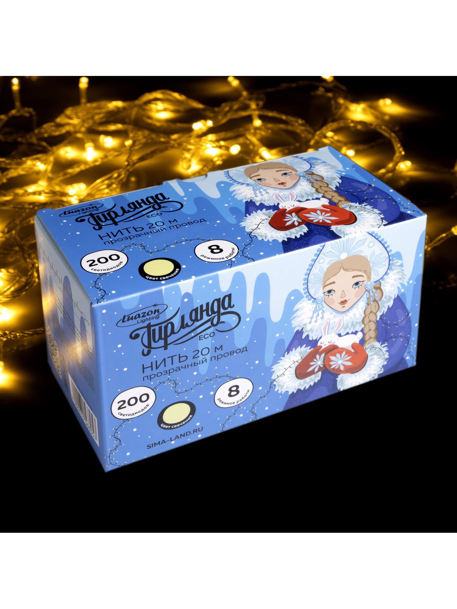 Гирлянда "Нить" 20 м, IP20, прозрачная нить, 200 LED, 8 режимов, 220 В, свечение тёплое белое, 8x15x9 см., Luazon Lighting, Китай