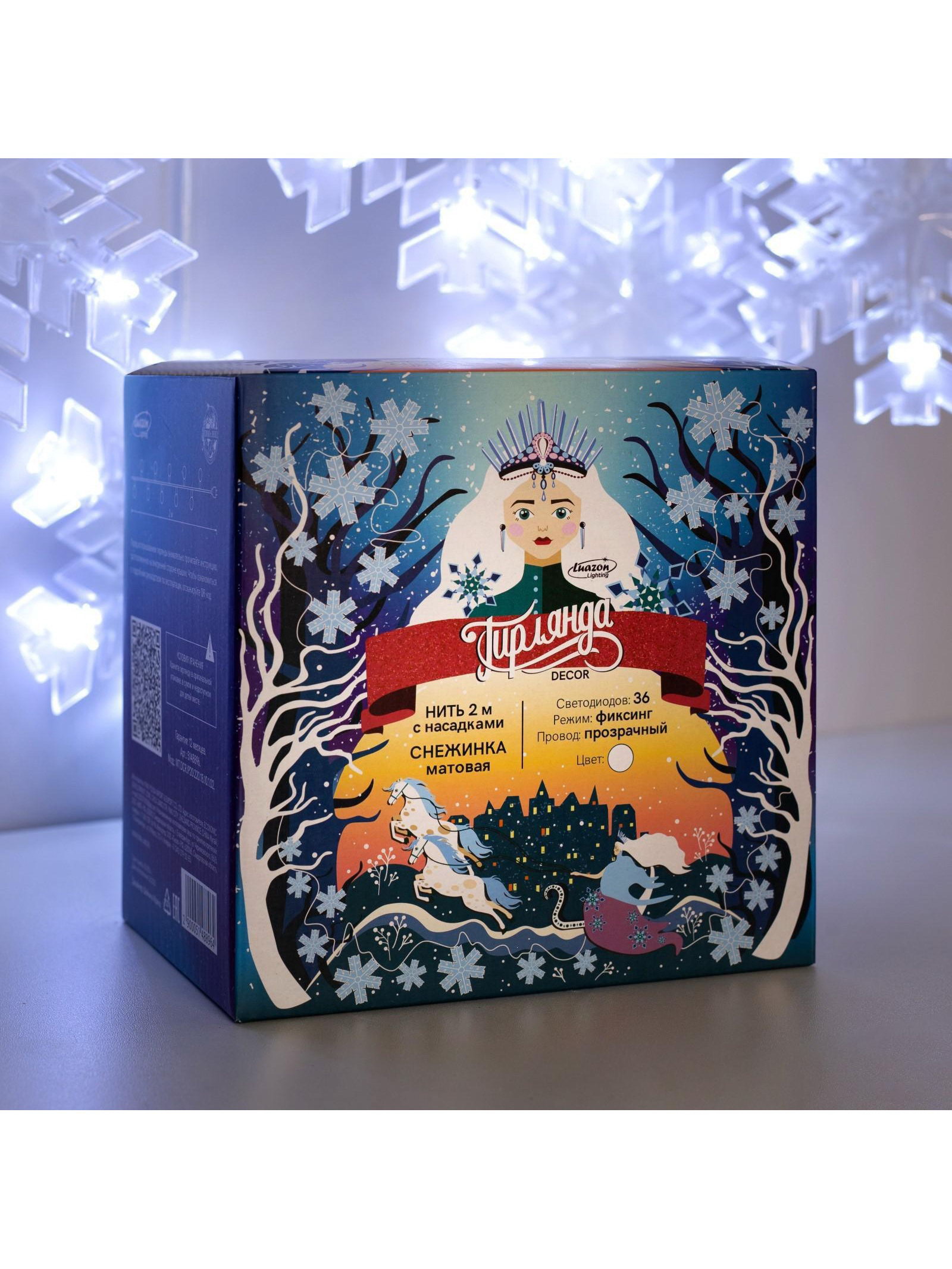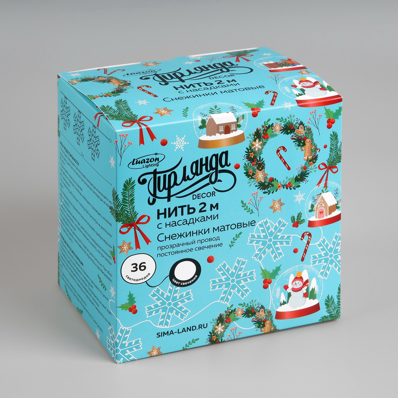 Гирлянда "Нить" 2 м с насадками "Снежинка матовая", IP20, прозрачная нить, 36 LED, свечение белое, 220 В, Luazon Lighting, Китай