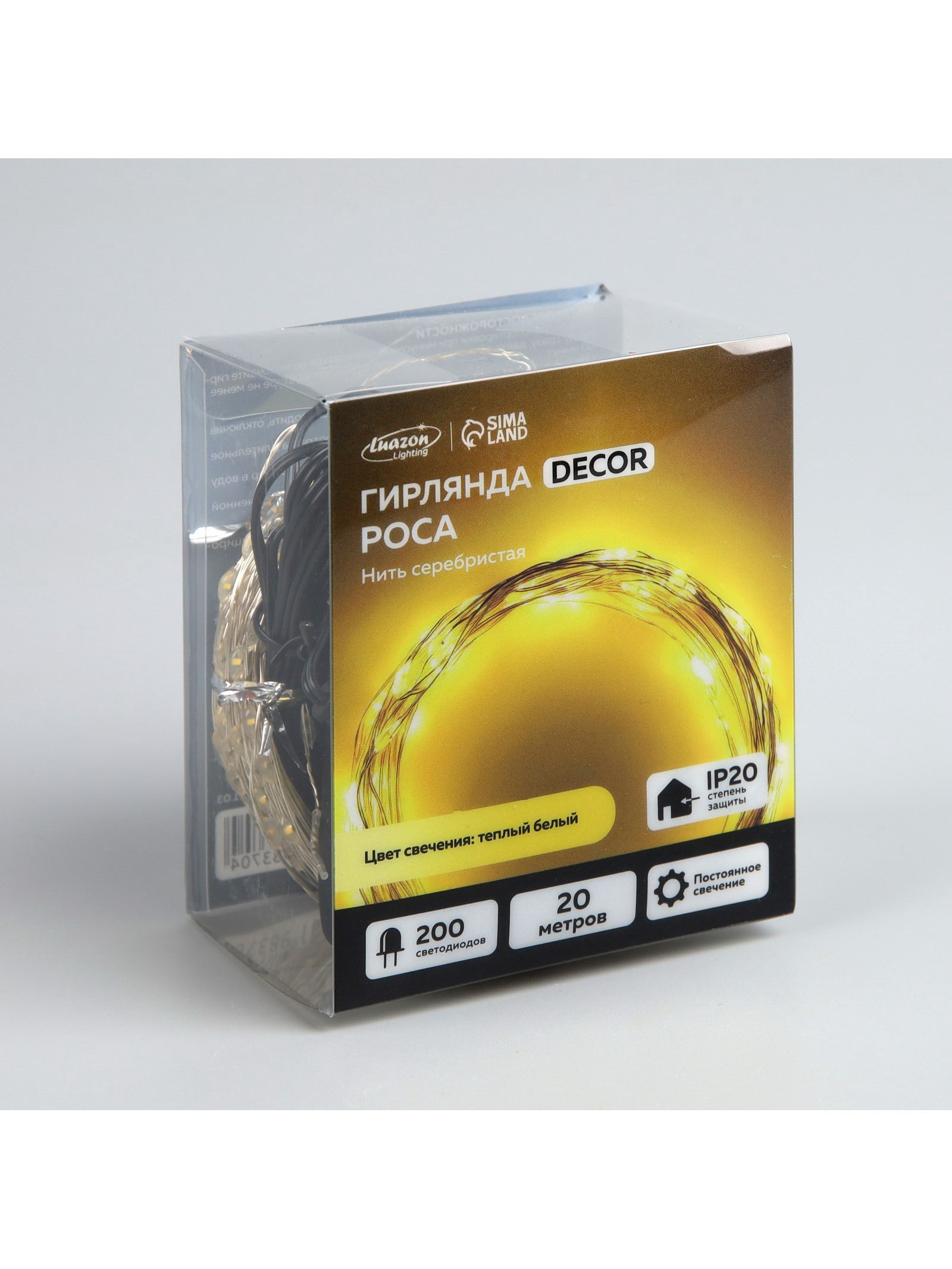 Гирлянда "Нить" 20 м, роса, IP20, серебристая нить, 200 LED, свечение тёплое белое, 12 В, Luazon Lighting, Китай