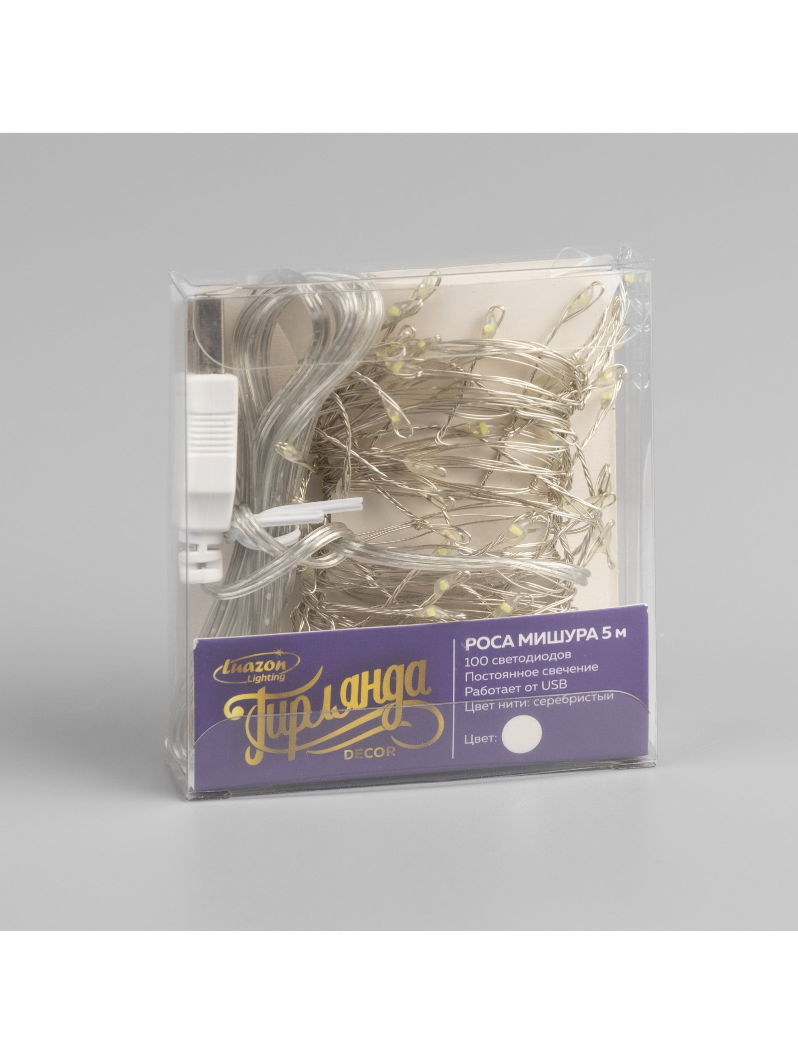 Гирлянда "Мишура" 5 м, роса, IP20, серебристая нить, 100 LED, свечение белое, USB, Luazon Lighting, Китай