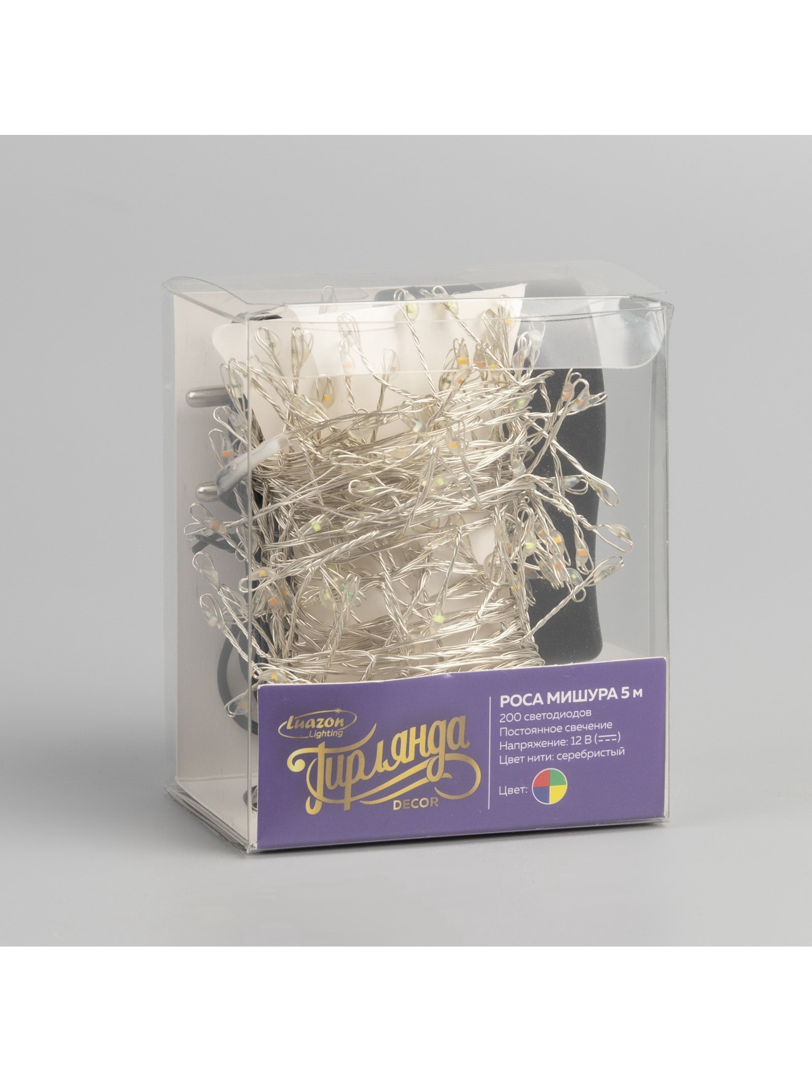 Гирлянда "Мишура" 5 м, роса, IP20, серебристая нить, 200 LED, свечение мульти, 12 В, Luazon Lighting, Китай