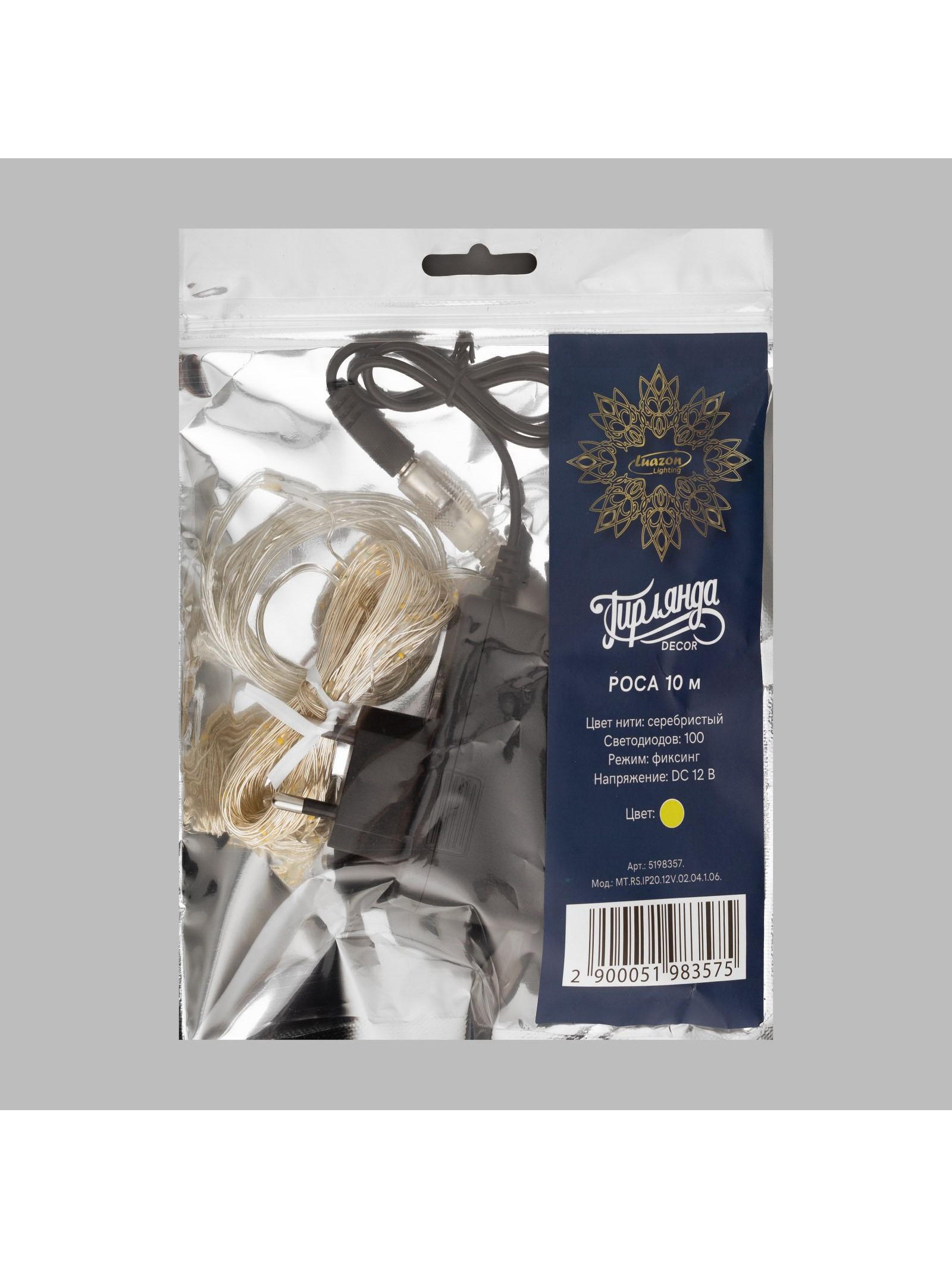Гирлянда "Нить" 10 м, роса, IP20, серебристая нить, 100 LED, свечение жёлтое, 12 В, Luazon Lighting, Китай