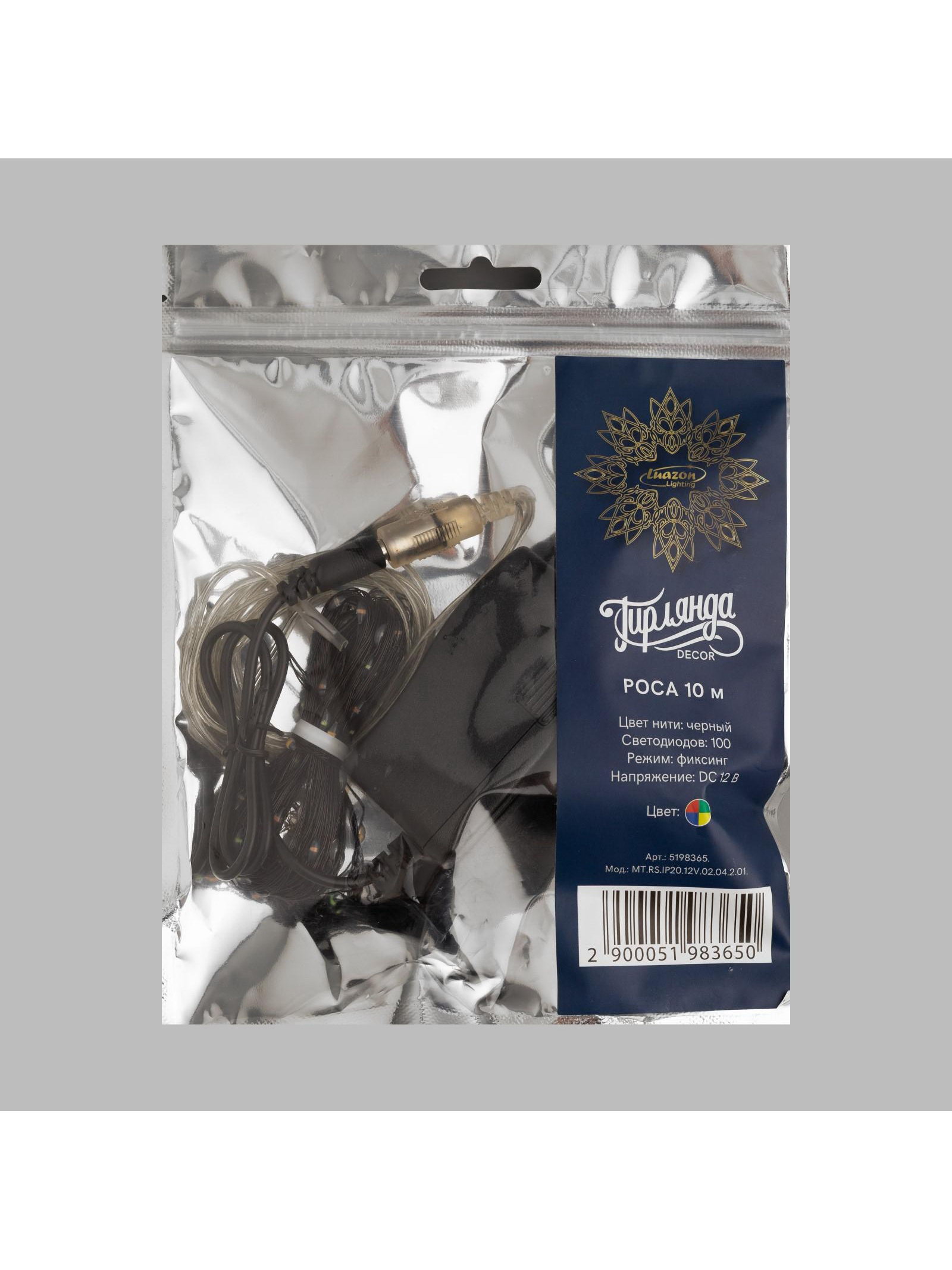 Гирлянда "Нить" 10 м роса, IP20, чёрная нить, 100 LED, свечение мульти, 12 В, Luazon Lighting, Китай