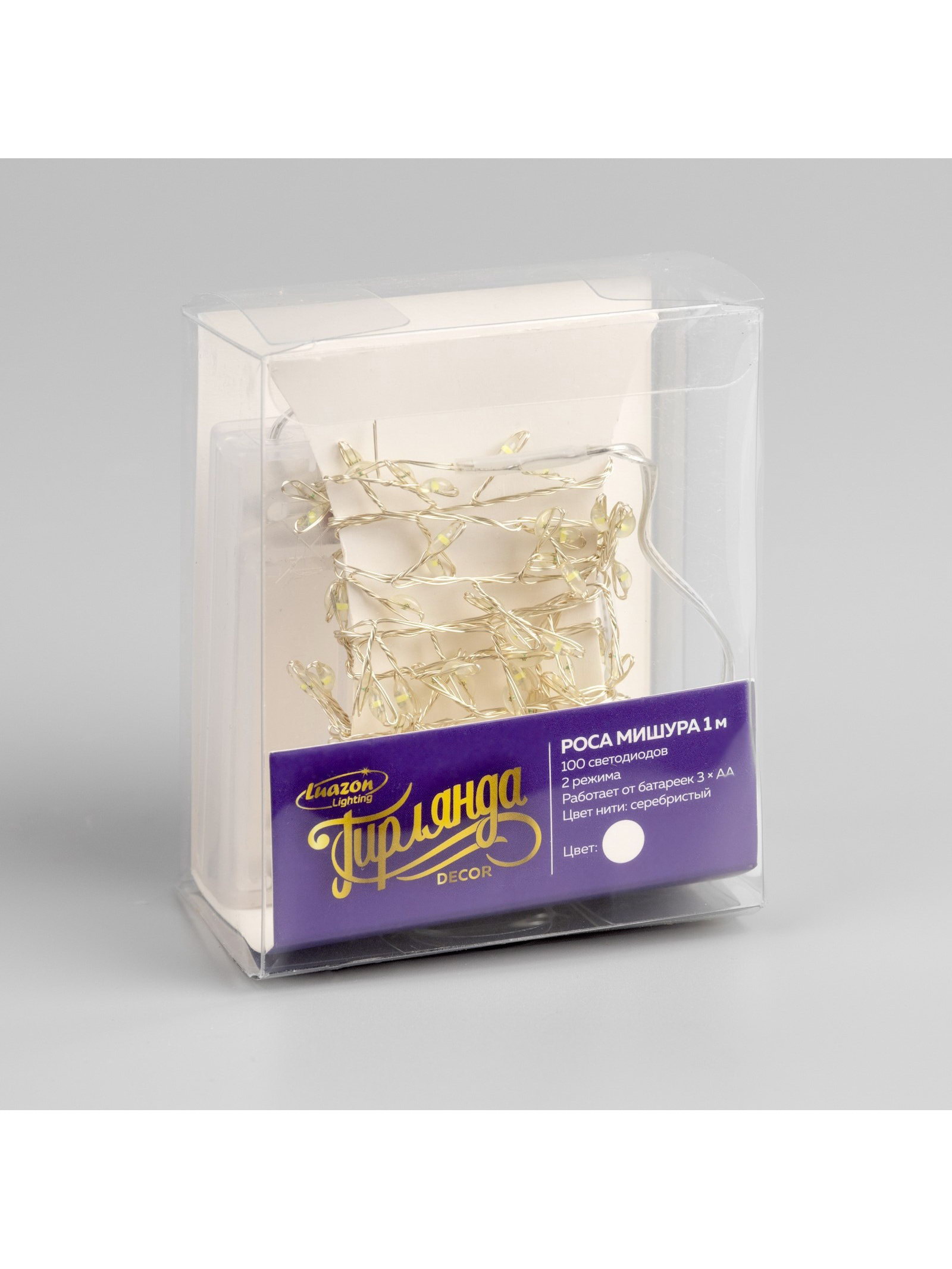 Гирлянда "Мишура" 1 м, роса, IP20, серебристая нить, 100 LED, 2 режима, от батареек ААx3, свечение белое, Luazon Lighting, Китай