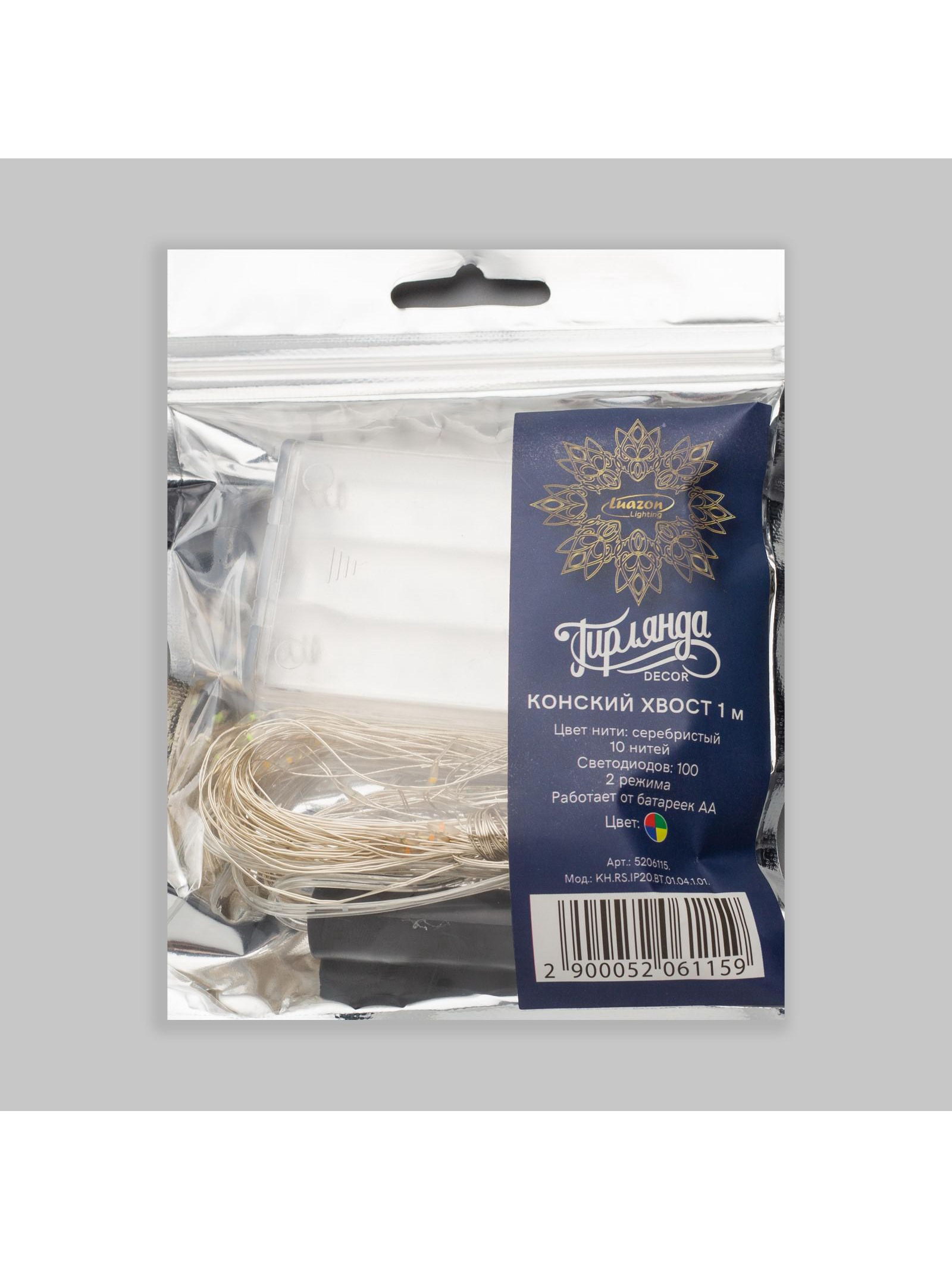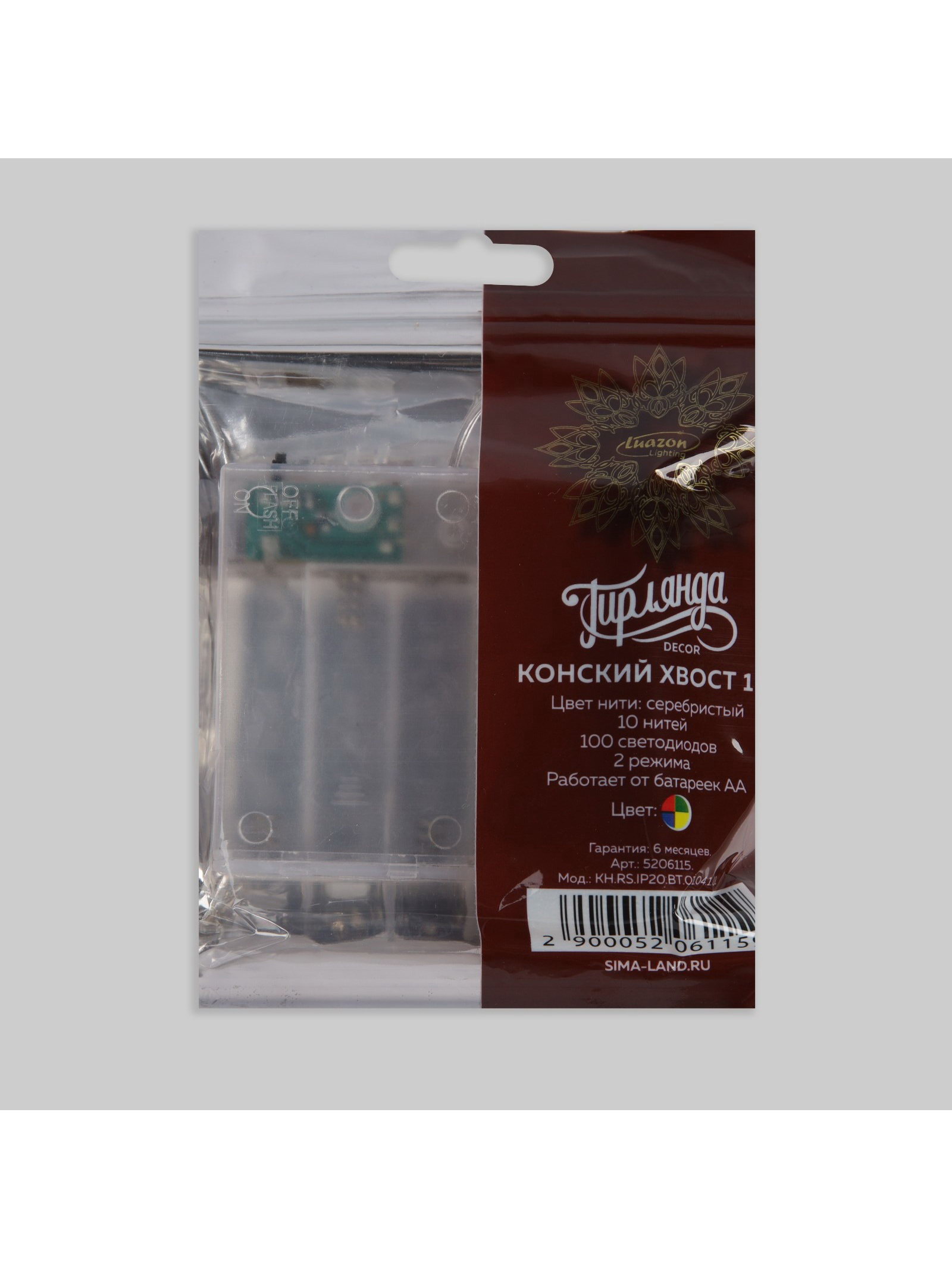 Гирлянда "Конский хвост" 10 нитей по 1 м, IP20, серебристая нить, 100 LED, 2 режима, от батареек ААx3, свечение мульти, Luazon Lighting, Китай