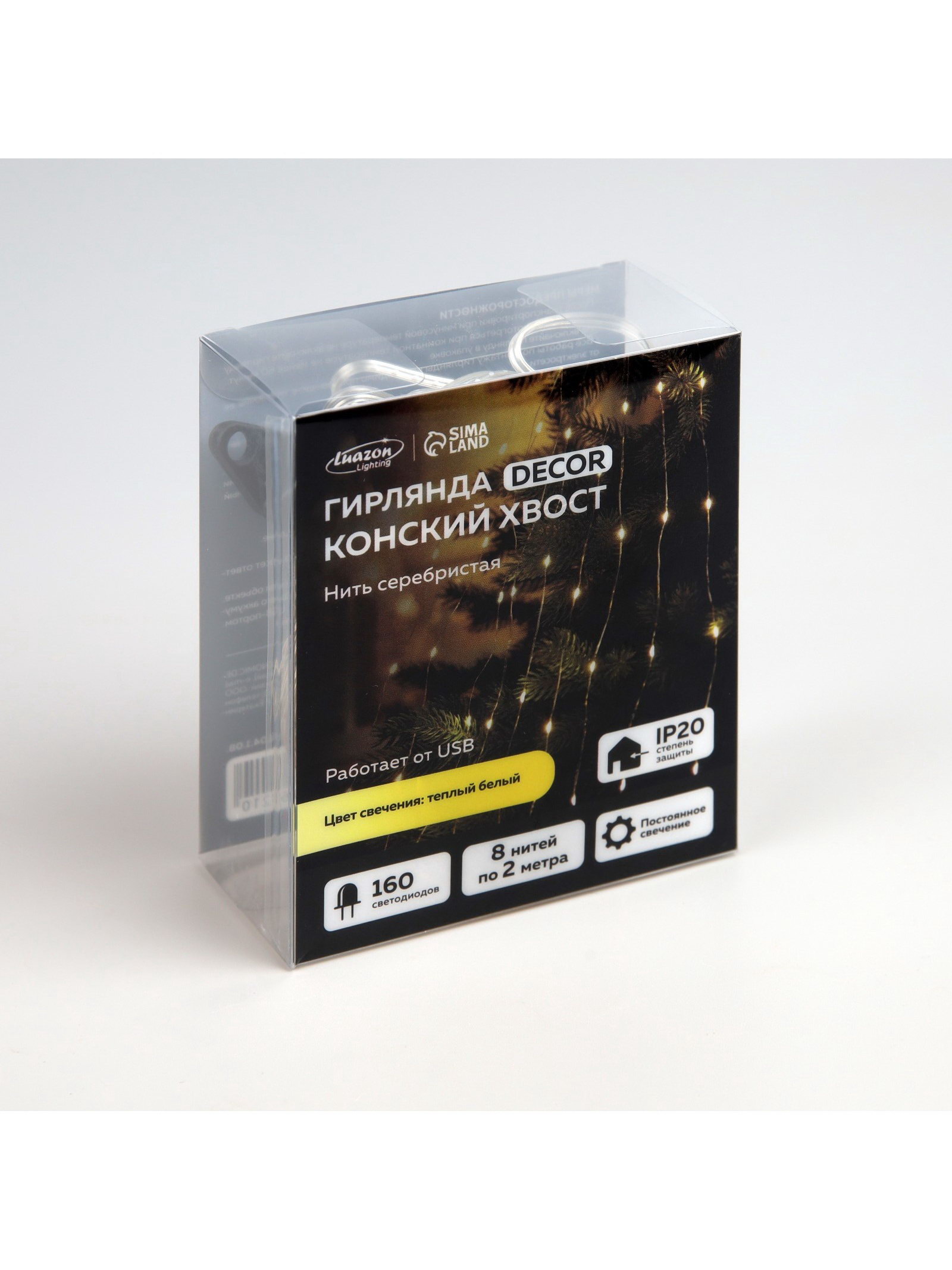 Гирлянда "Конский хвост" 8 нитей по 2 м, IP20, серебристая нить, 160 LED, свечение тёплое белое, USB, Luazon Lighting, Китай