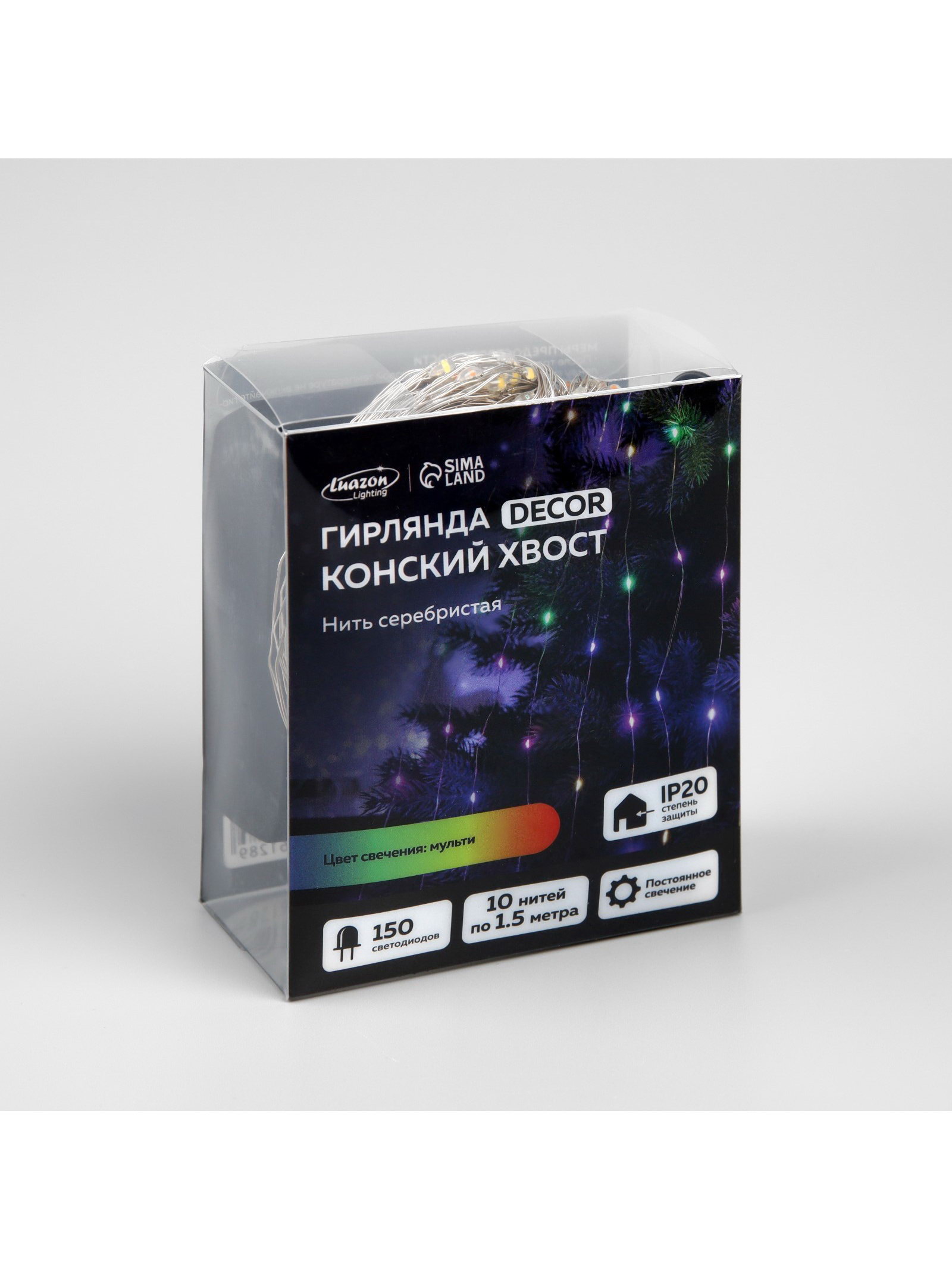 Гирлянда "Конский хвост" 10 нитей по 1.5 м, IP20, серебристая нить, 150 LED, свечение мульти, 12 В, 8x10x5 см., Luazon Lighting, Китай
