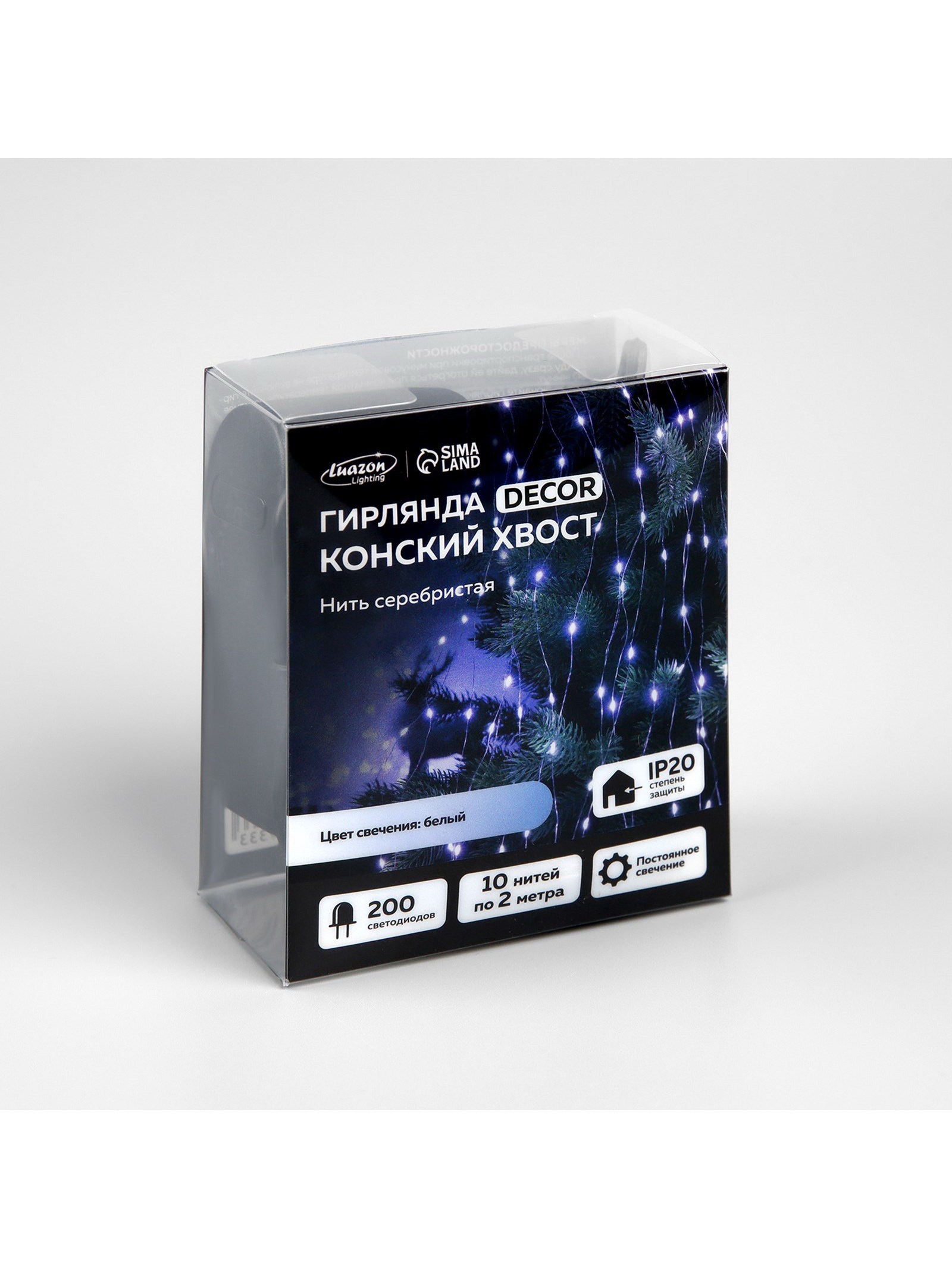 Гирлянда "Конский хвост" 10 нитей по 2 м, IP20, серебристая нить, 200 LED, свечение белое, 12 В, Luazon Lighting, Китай