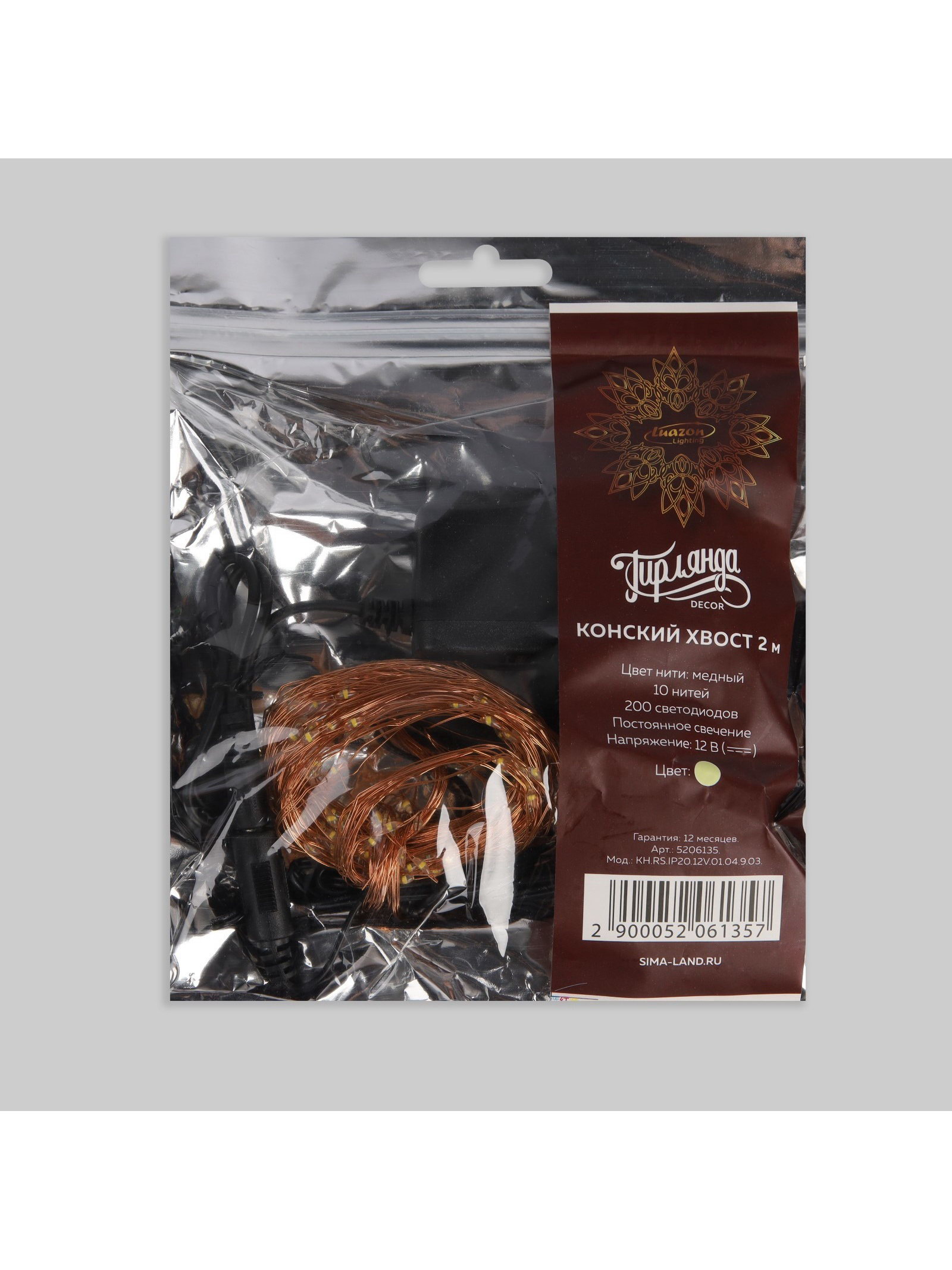 Гирлянда "Конский хвост" 10 нитей по 2 м, IP20, медная нить, 200 LED, свечение тёплое белое, 12 В, Luazon Lighting, Китай