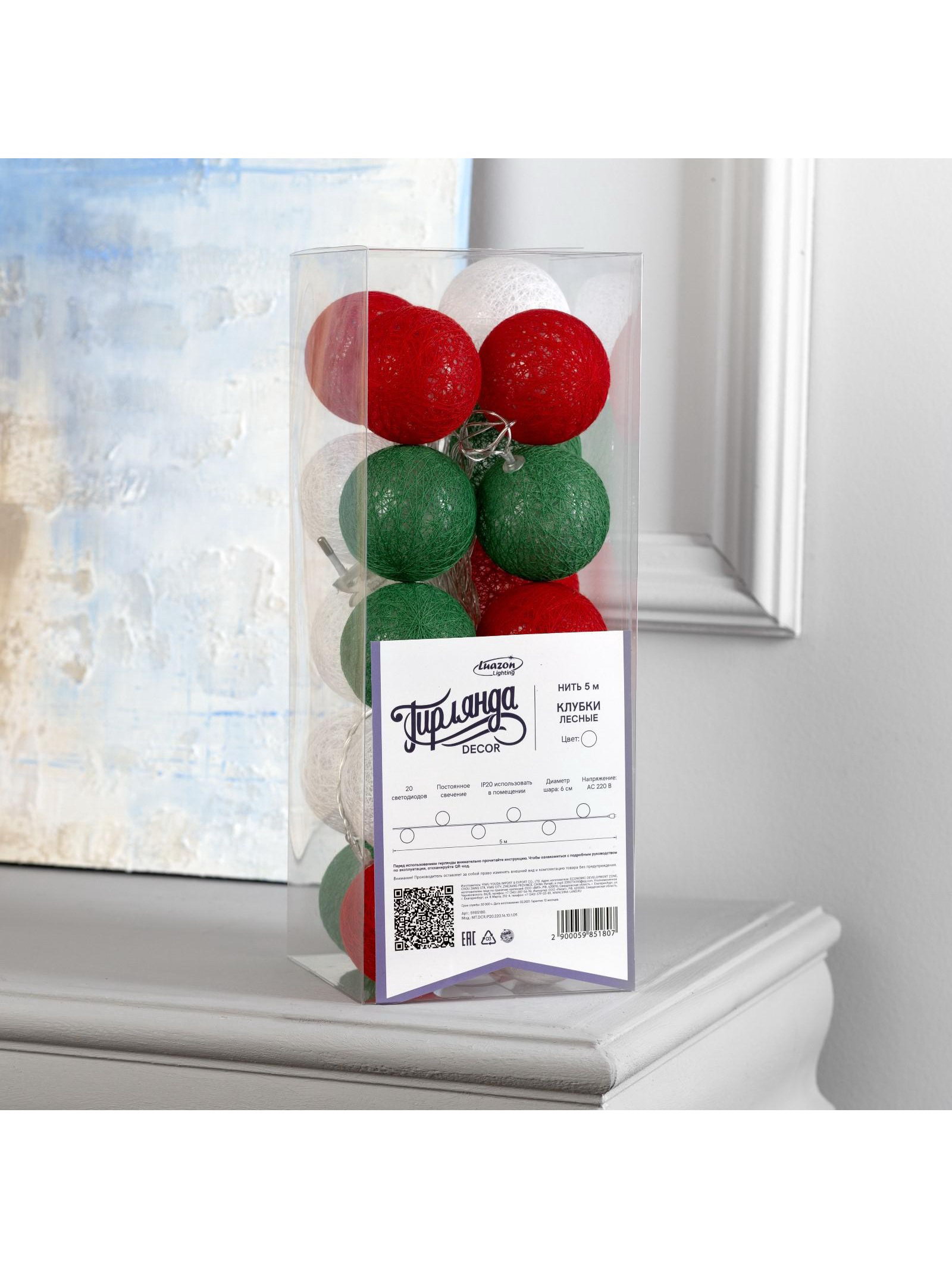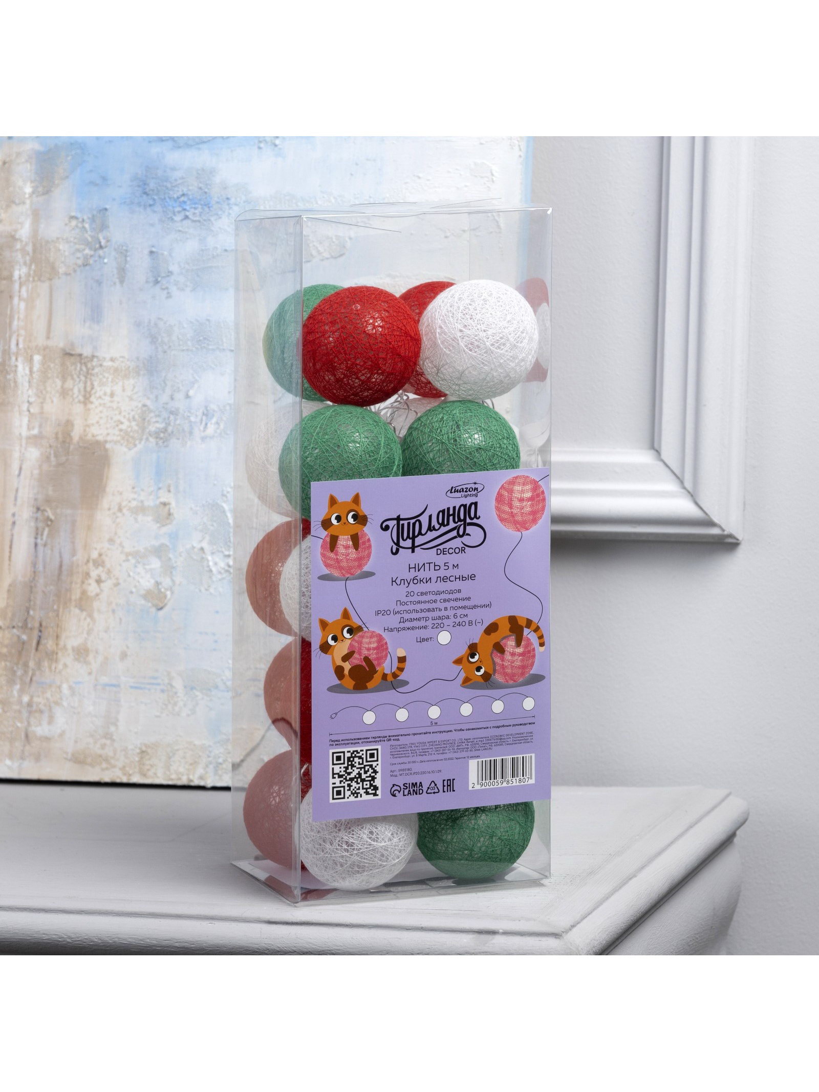 Гирлянда "Нить" 5 м с насадками "Клубки лесные", IP20, прозрачная нить, 20 LED, свечение белое, 220 В, Luazon Lighting, Китай