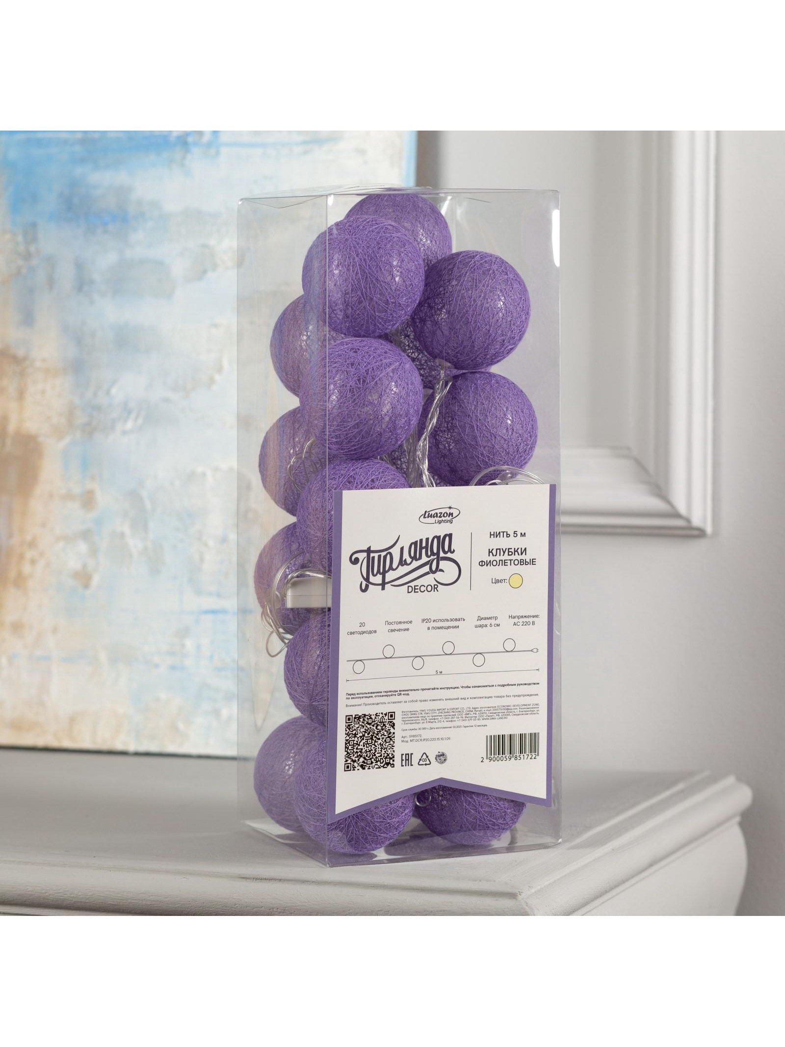 Гирлянда "Нить" 5 м с насадками "Клубки фиолетовые", IP20, прозрачная нить, 20 LED, свечение тёплое белое, 220 В, 6 см., Luazon Lighting, Китай