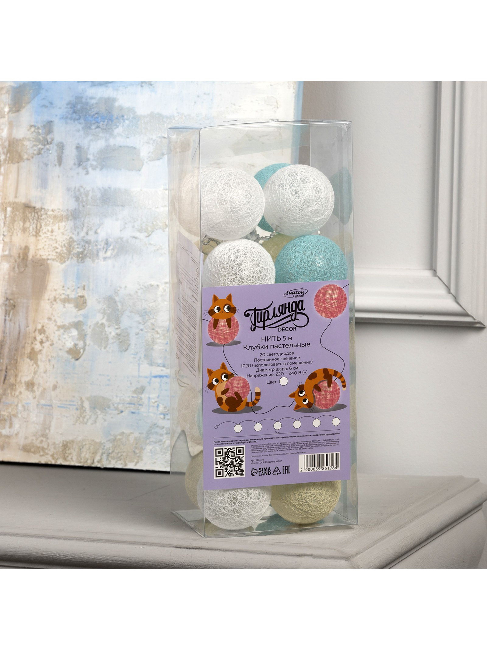 Гирлянда "Нить" 5 м с насадками "Клубки пастельные", IP20, прозрачная нить, 20 LED, свечение белое, 220 В, 6 см., Luazon Lighting, Китай
