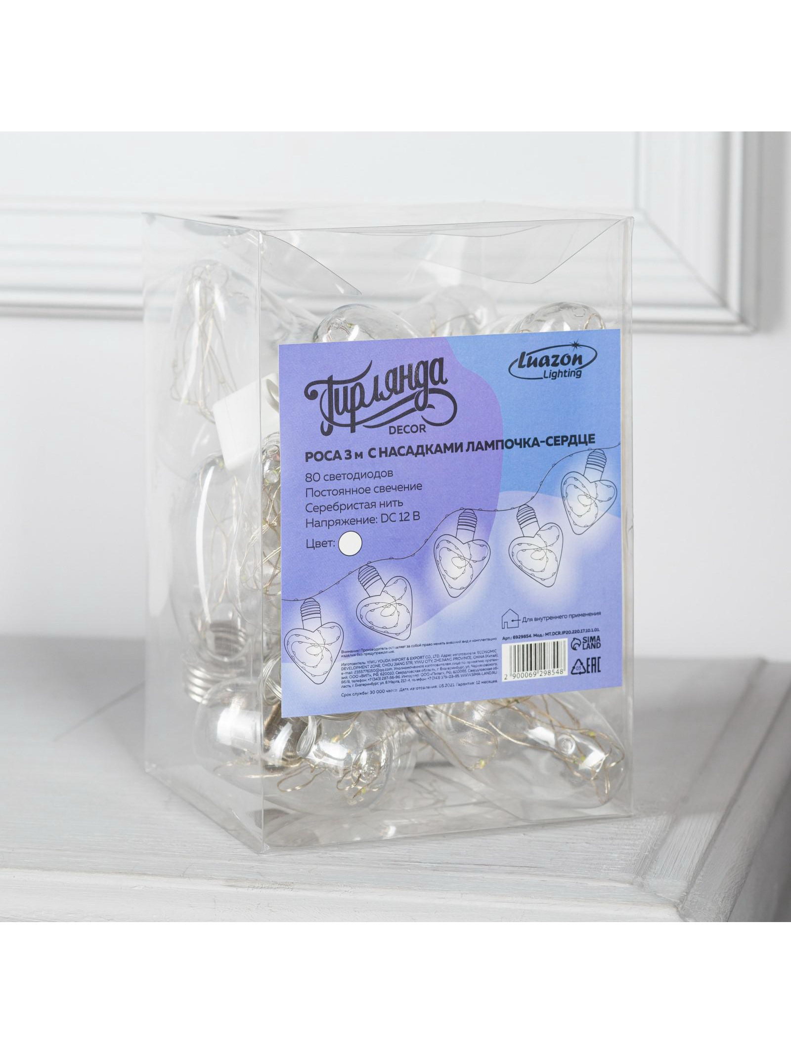 Гирлянда "Нить" 3 м с насадками "Лампочки сердца", IP20, прозрачная нить, 80 LED, свечение белое, 8 режимов, 220 В, Luazon Lighting, Китай