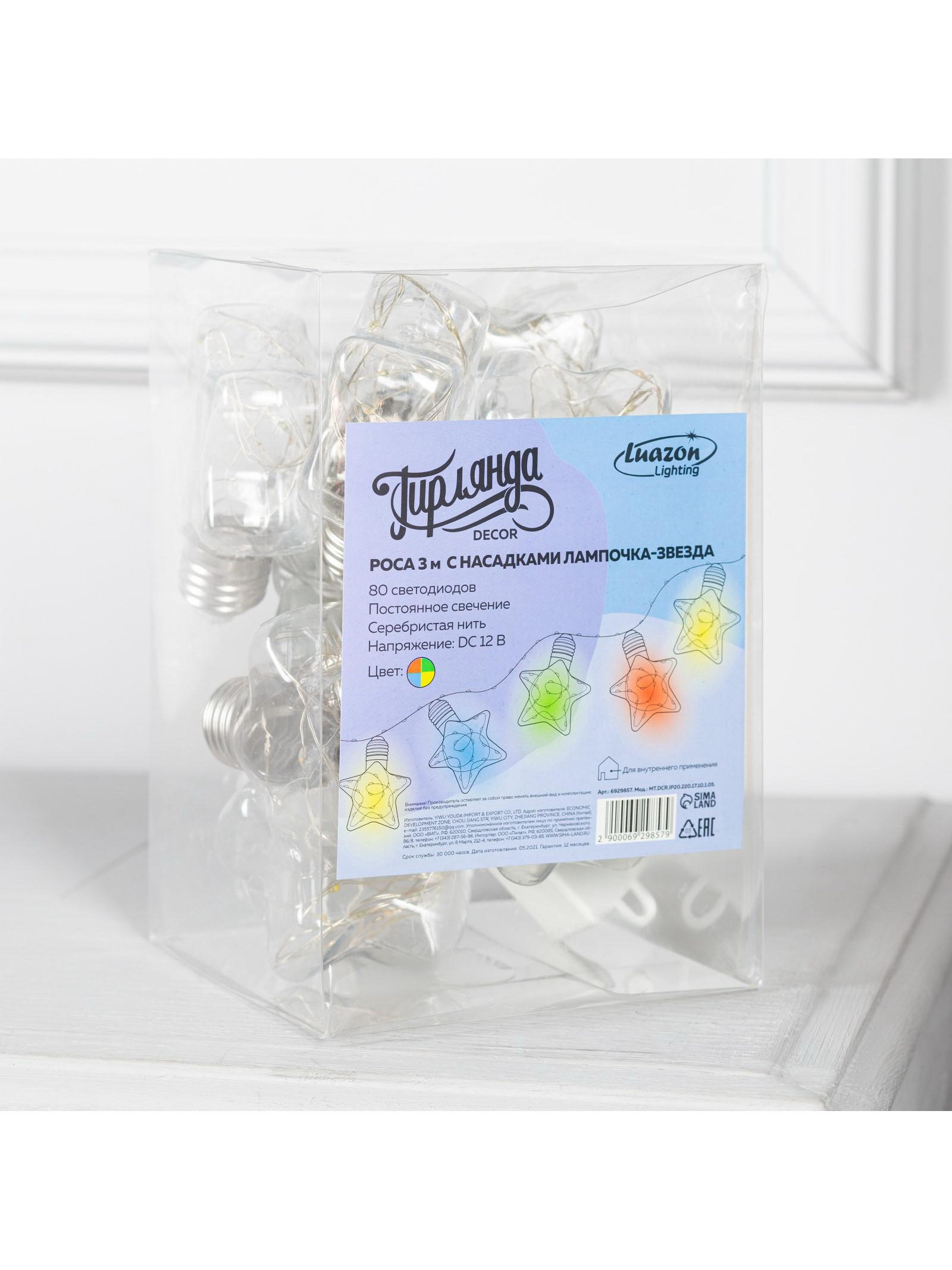 Гирлянда "Нить" 3 м с насадками "Лампочки звёздочки", IP20, прозрачная нить, 80 LED, свечение мульти, 8 режимов, 220 В, Luazon Lighting, Китай
