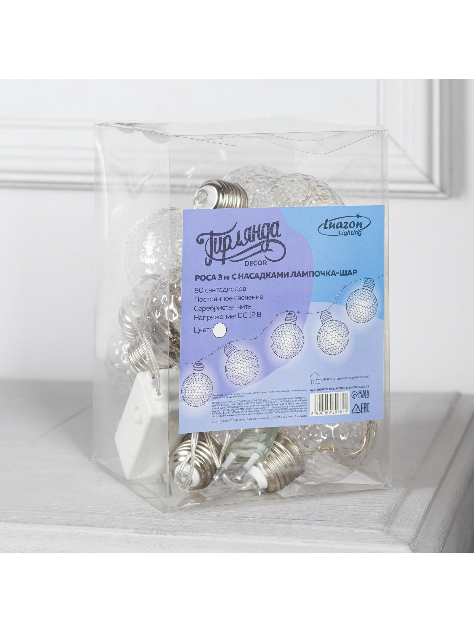Гирлянда "Нить" 3 м с насадками "Лампочки шары", IP20, прозрачная нить, 80 LED, свечение белое, 8 режимов, 220 В, Luazon Lighting, Китай