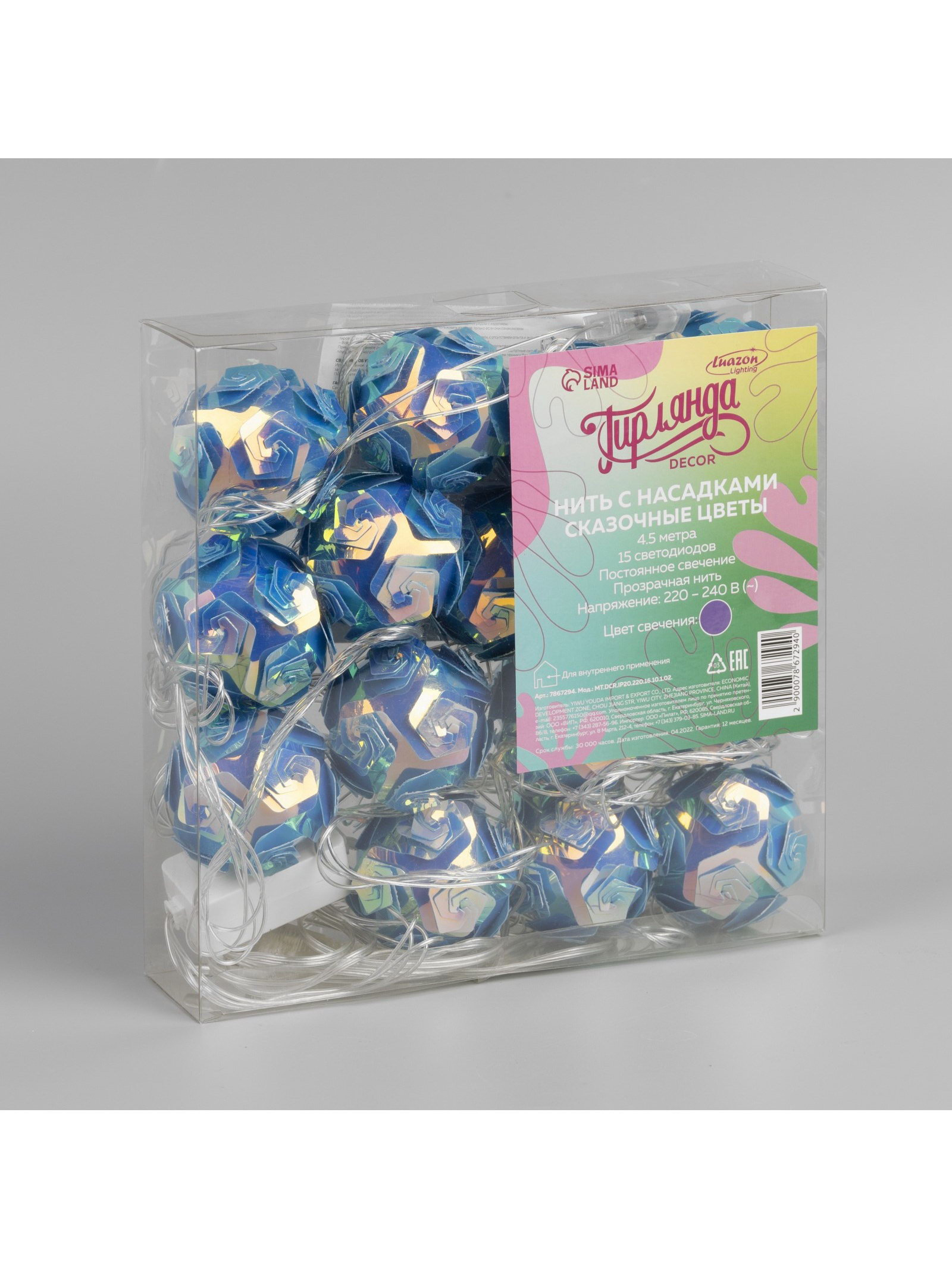 Размер упаковки: 20 x 5 x 20 см. Материал насадок: Пластик tnved: 9405420000 Гарантийный срок, мес.: 12 Наличие блока питания: Да Количество режимов: 1 Длина, м: 4.5 Насадки: Да Количество ламп: 15 Цвет нити гирлянды: Прозрачный Материал нити: ПВХ Вид лампы: Светодиодная Цвет свечения: Фиолетовый Степень защиты: IP20 Тип подключения: Шнур питания Вид гирлянды: Гирлянда-нить Применение: Внутреннее Необходимая комплектация: Не нужна Режим работы: Постоянное свечение Температурный режим: От -10 до +35 ℃ Тип питания: От сети 220 В
