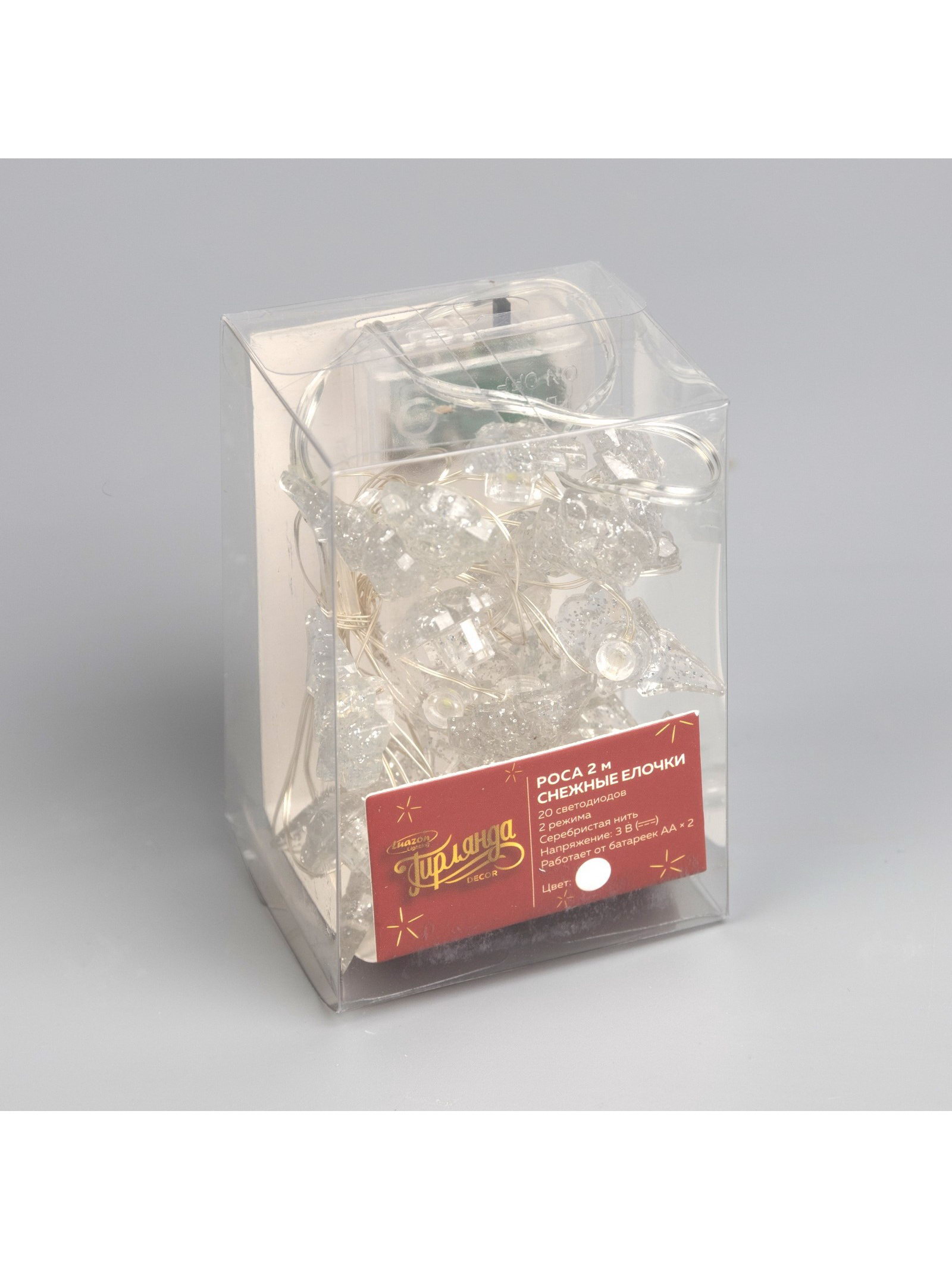 Гирлянда "Нить" 2 м, роса с насадками "Снежная ёлочка", IP20, серебристая нить, 20 LED, 2 режима, от батареек ААx2, свечение белое, Luazon Lighting, Китай