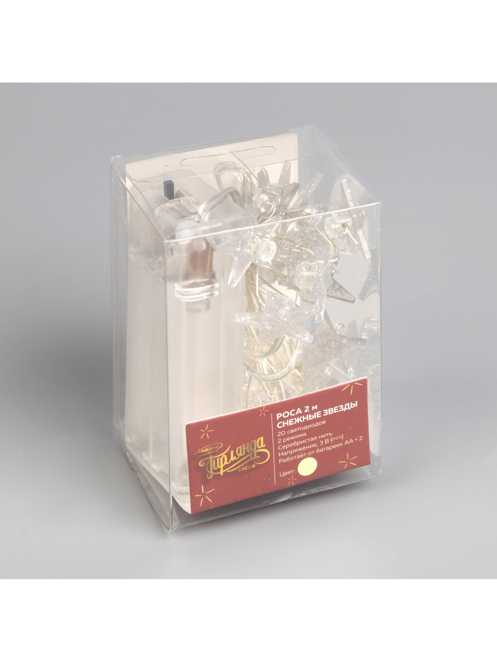 Гирлянда "Нить" 2 м, роса с насадками "Снежная звезда", IP20, серебристая нить, 20 LED, 2 режима, от батареек ААx2, свечение тёплое белое, 5.5x8x5 см., Luazon Lighting, Китай