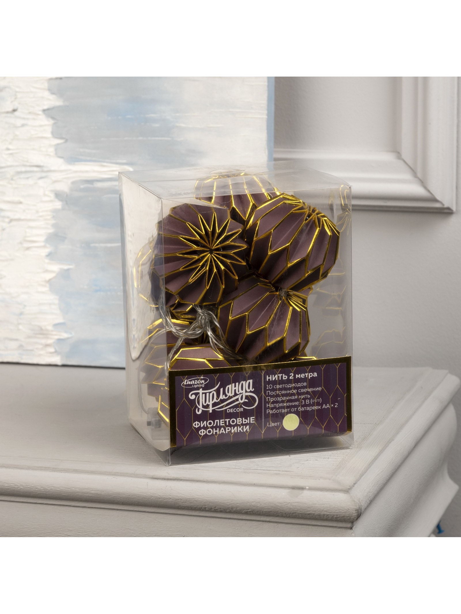 Гирлянда "Нить" 2 м с насадками "Фиолетовый фонарик", IP20, прозрачная нить, 10 LED, от батареек ААx2, свечение тёплое белое, 14x14x20 см., Luazon Lighting, Китай