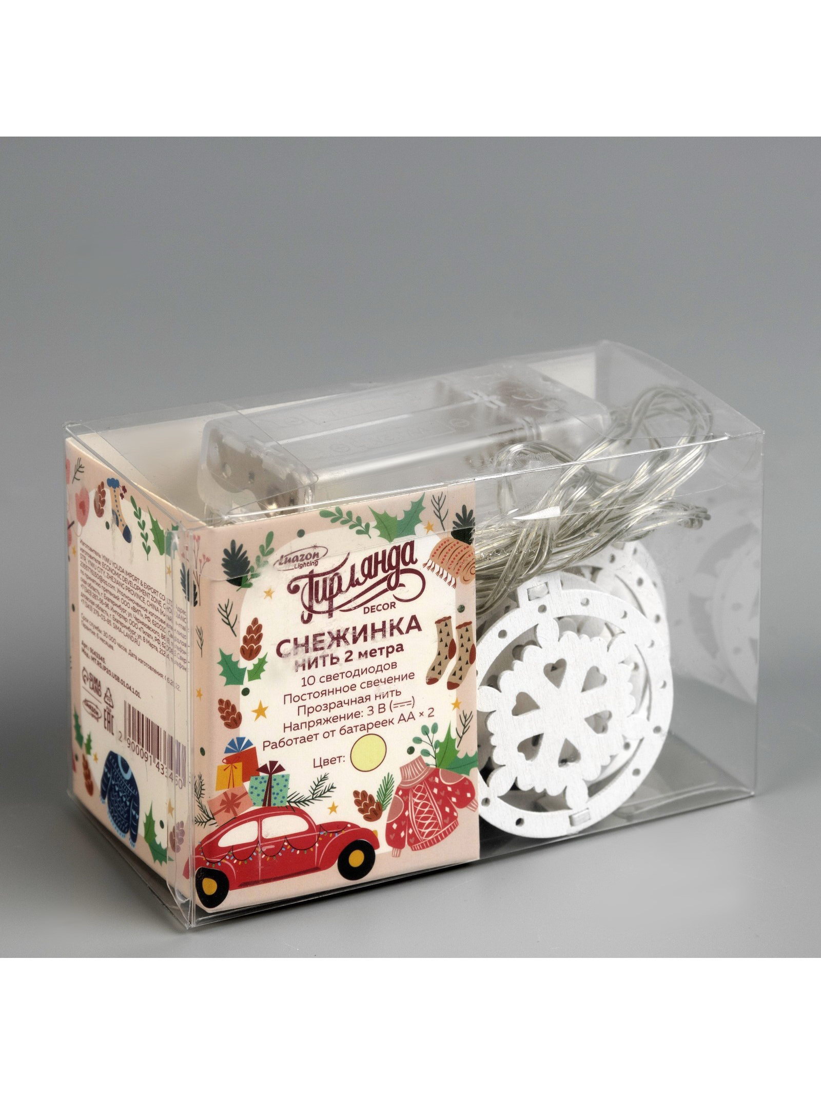 Гирлянда "Нить" 2 м с насадками "Снежинка", IP20, прозрачная нить, 10 LED, батарейки AAх2, Luazon Lighting, Китай
