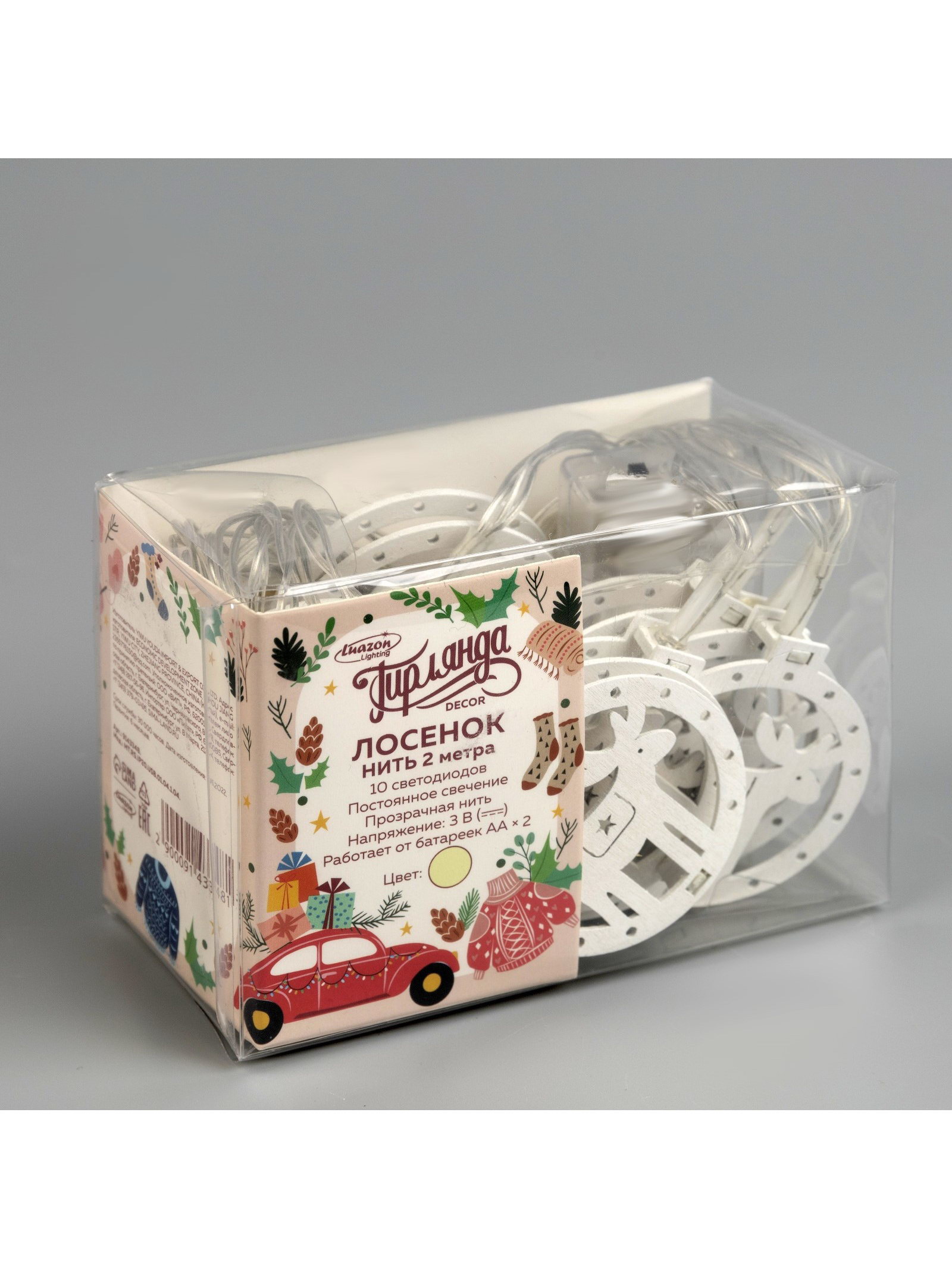 Гирлянда "Нить" 2 м с насадками "Оленёнок", IP20, прозрачная нить, 10 LED, батарейки AAх2, Luazon Lighting, Китай