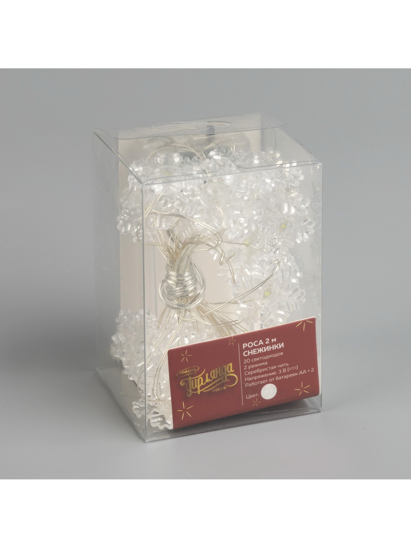 Гирлянда "Нить" 2 м, роса с насадками "Снежинка", IP20, серебристая нить, 20 LED, 2 режима, от батареек ААx2, свечение белое, 5.5x8x5 см., Luazon Lighting, Китай